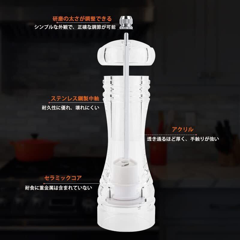 【手動胡椒ミルの材料とサイズ】製品サイズ:外径160x高さ50mm 研磨器キャップと容器蓋はアクリルです。透明なボトルは、残留量がはっきりと見え、耐久性が高く、非常に衛生的です。 ミル内部に高硬度のセラミック刃を使用し、耐久性、耐食性にも優れています。 注意:香料は含まれていません。
