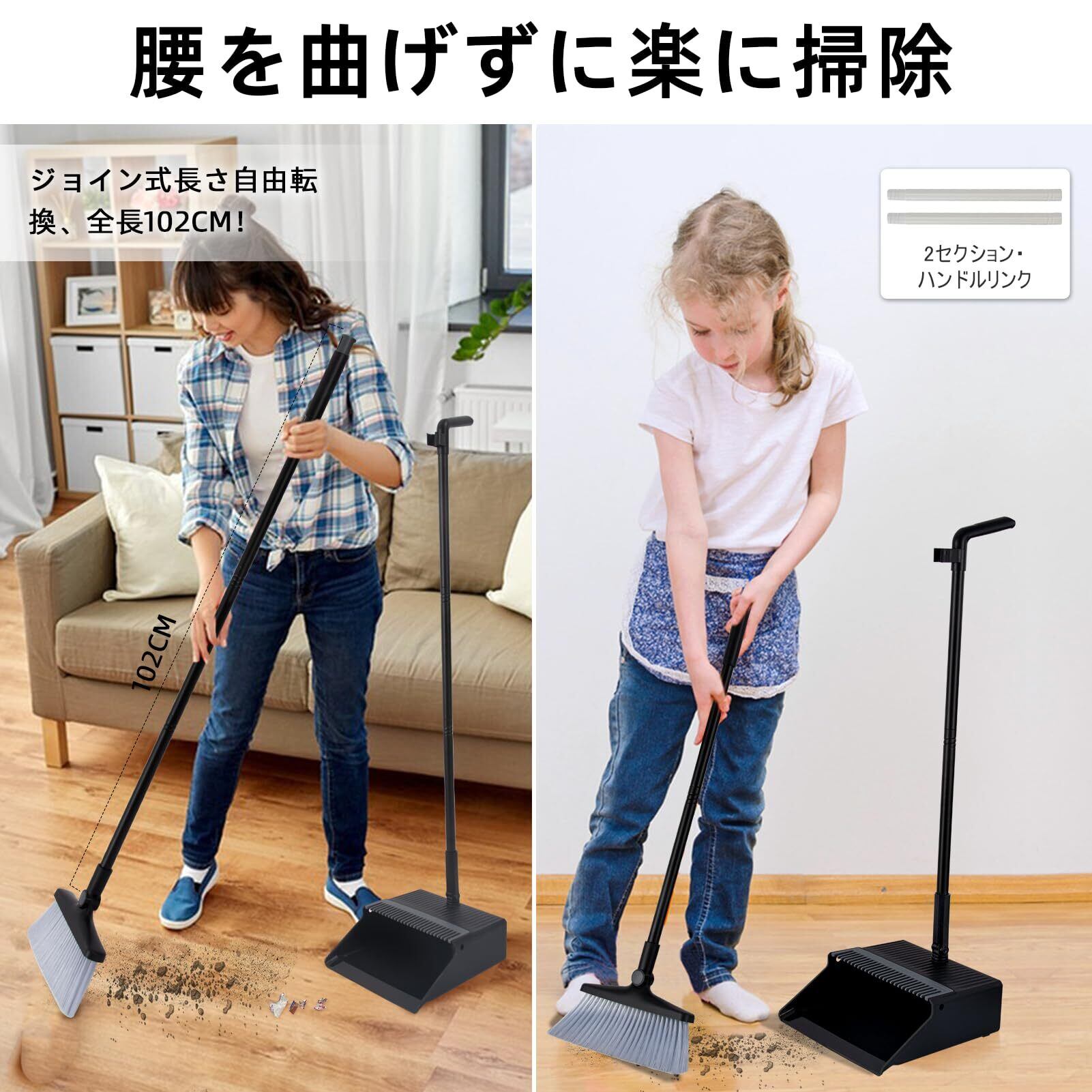 【楽に掃除】:ほうきは53.5㎝~102㎝までの長さを調整することができます。腰を曲げず、楽に掃除できます。くしが付いので、手を汚さずにほうきに付いた髪の毛をきれいに落とします。