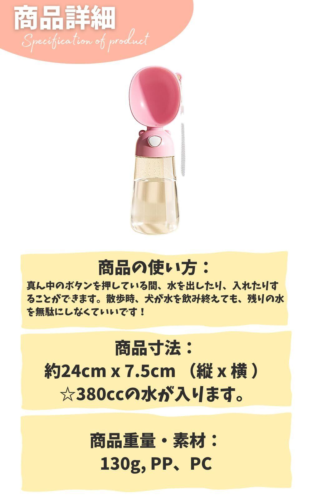 【数量限定】ペット用水筒 ウォーターボトル 散歩 水飲み ペット水飲み器 水漏れ防止 手軽に水分補給が出来る 外出 ペット用品 水飲みボトル 380cc (ピンク, 0.38L)