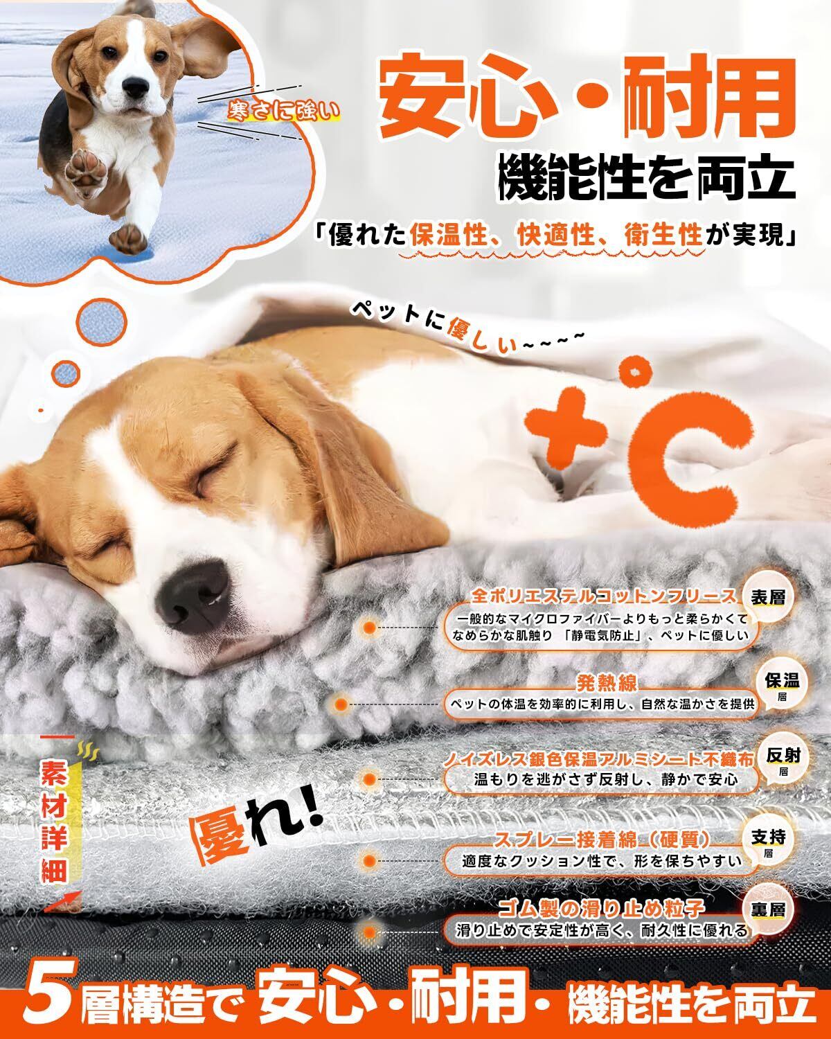 極細炭素繊維ペットホットマット:独自の繊維を採用し、保温性能が通常のペットマットの1.5倍!ふわふわで柔らかい生地がペットの肉球を優しく包み込み、内部は静音素材を使用しているため、ペットが動いてもサラサラと不快な音が立てず、安眠を妨げません。