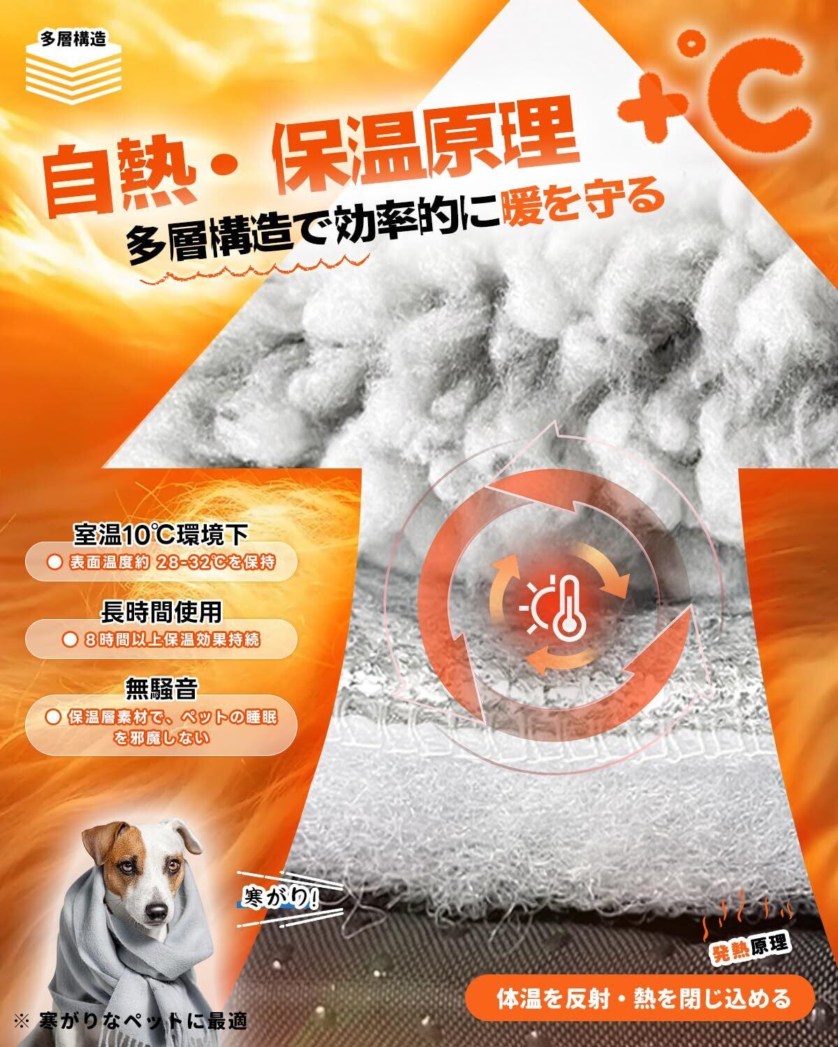 ペットあったかマット【電気不要】:ペット用保温マットは、コードや電池を一切使わないから、感電のリスクがなく、室内外を問わずずっと安心してお使いいただけます。その温かさのヒミツは、特殊な素材がペット自身の体温を効率よく反射し、優しい保温効果を生み出す仕組み。ペットの体に寄り添う、自然な温もりを実現しました。