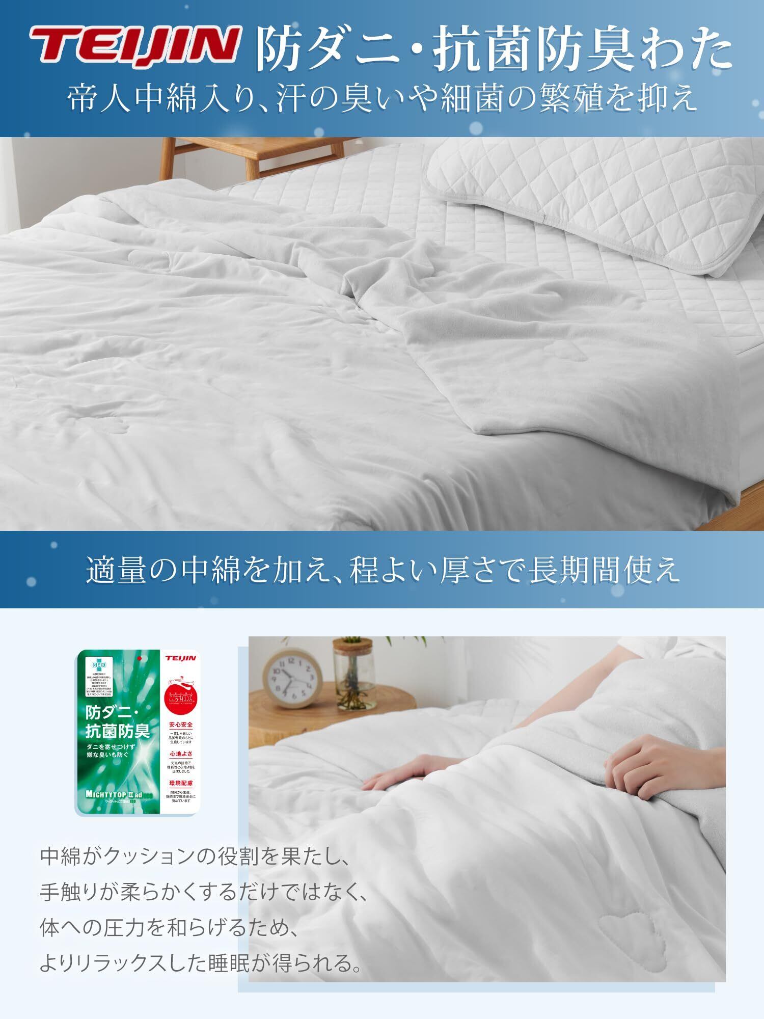 <防ダニ・抗菌防臭>中わたには防ダニ・抗菌防臭効果のある帝人「マイティトップⅡ」繊維を使用しています。汗の臭いや細菌の繁殖を抑える、清潔感を保ちます。