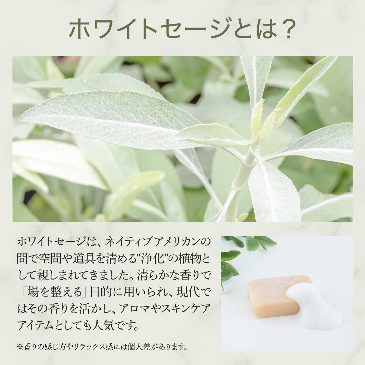 天然のホワイトセージ精油の香りが心を清めます。