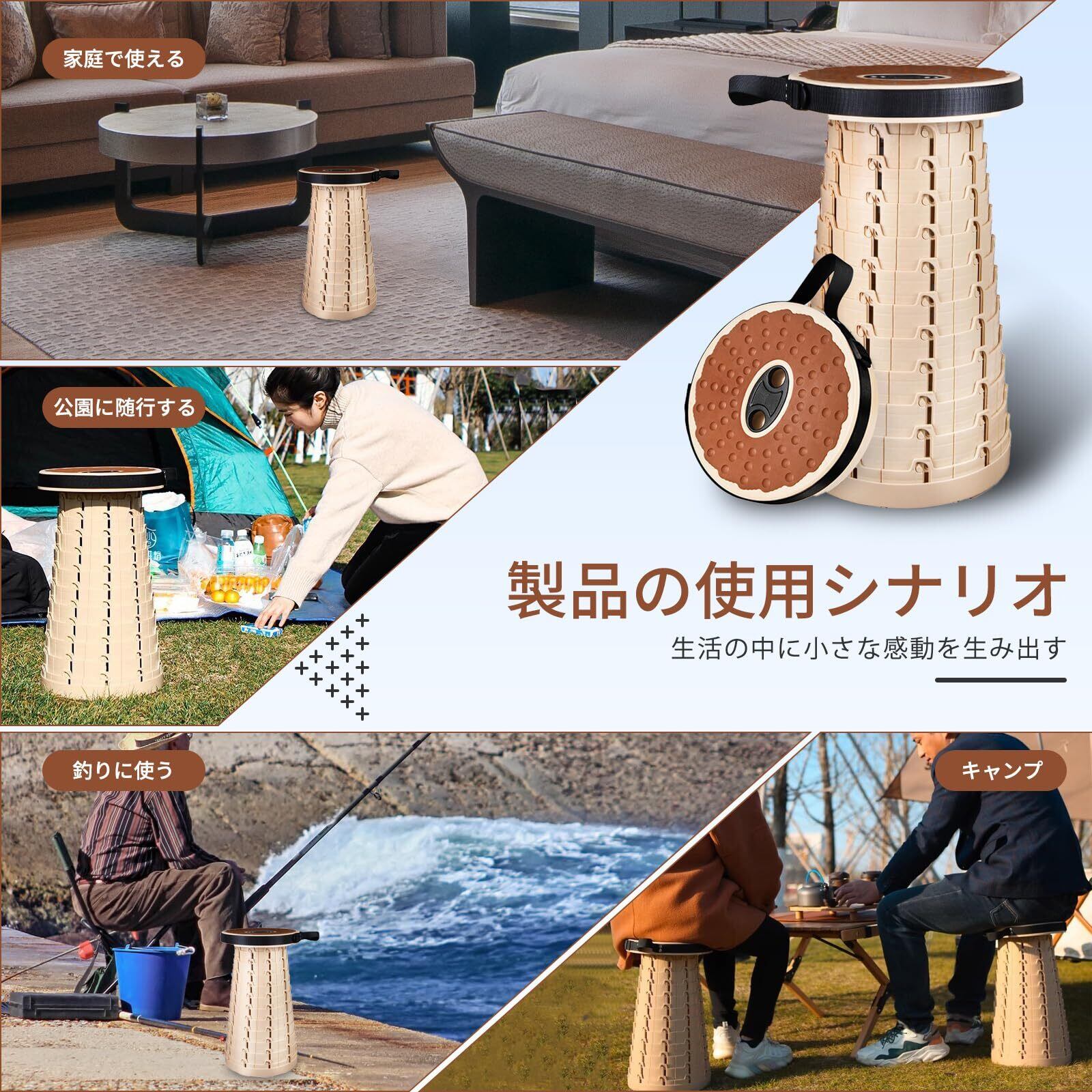 独自の折りたたみ設計とワンボタン操作:瞬時に広げて折りたためる独自の折りたたみ設計。使用前は丸い形になっており、椅子には見えません。広げると高さ45cmの快適な椅子に変化し、さらに12段階の高さ調節が可能です。組み立ても非常に簡単です。1. 両側のくぼみを引っ張って開き、2. 互いに向かって回転させ、3. 穴に掛けて組み立てを完了します。