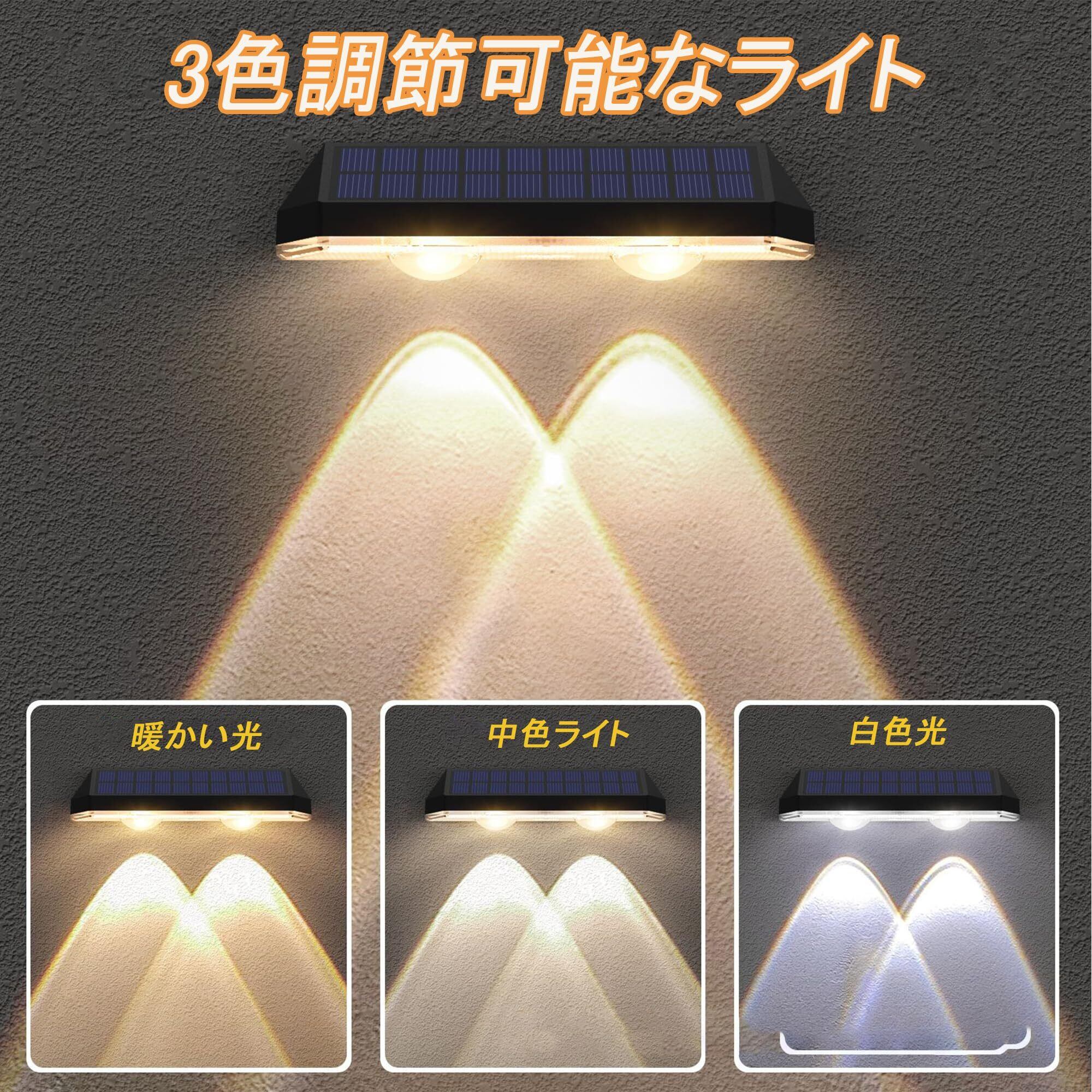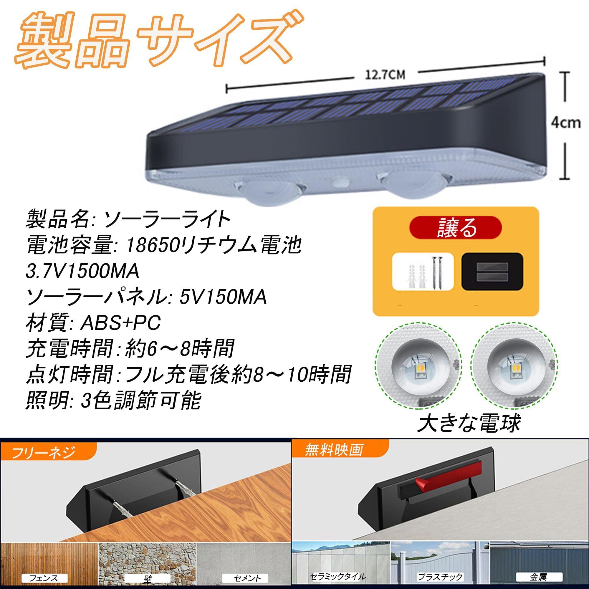 取り付け簡単: 粘着テープとネジが付属しており、配線や電池を購入する必要がなく、簡単に取り付けられます。太陽エネルギーを最大限に活用するために、できるだけ直射日光の当たる場所に置いてください。使用前に明るさを確保するために太陽光で充電してください。ソーラーライトは日中に光エネルギーを吸収し、電気エネルギーに変換します。日中にスイッチを入れてもライトは点灯しませんのでご注意ください。