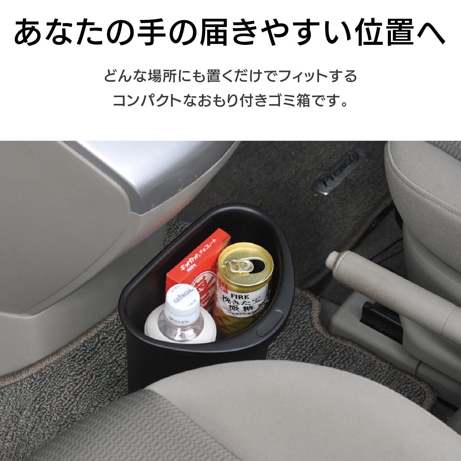半円形状のため、センターコンソール下のスペースや、シートの間、前席シートバック裏など、どんな場所にもぴったりフィットして収まる。500mlペットボトルが2本収納可能。底面におもりが付いているので、走行中の振動による転倒を防ぐ。サっと持ちやすいデザイン。