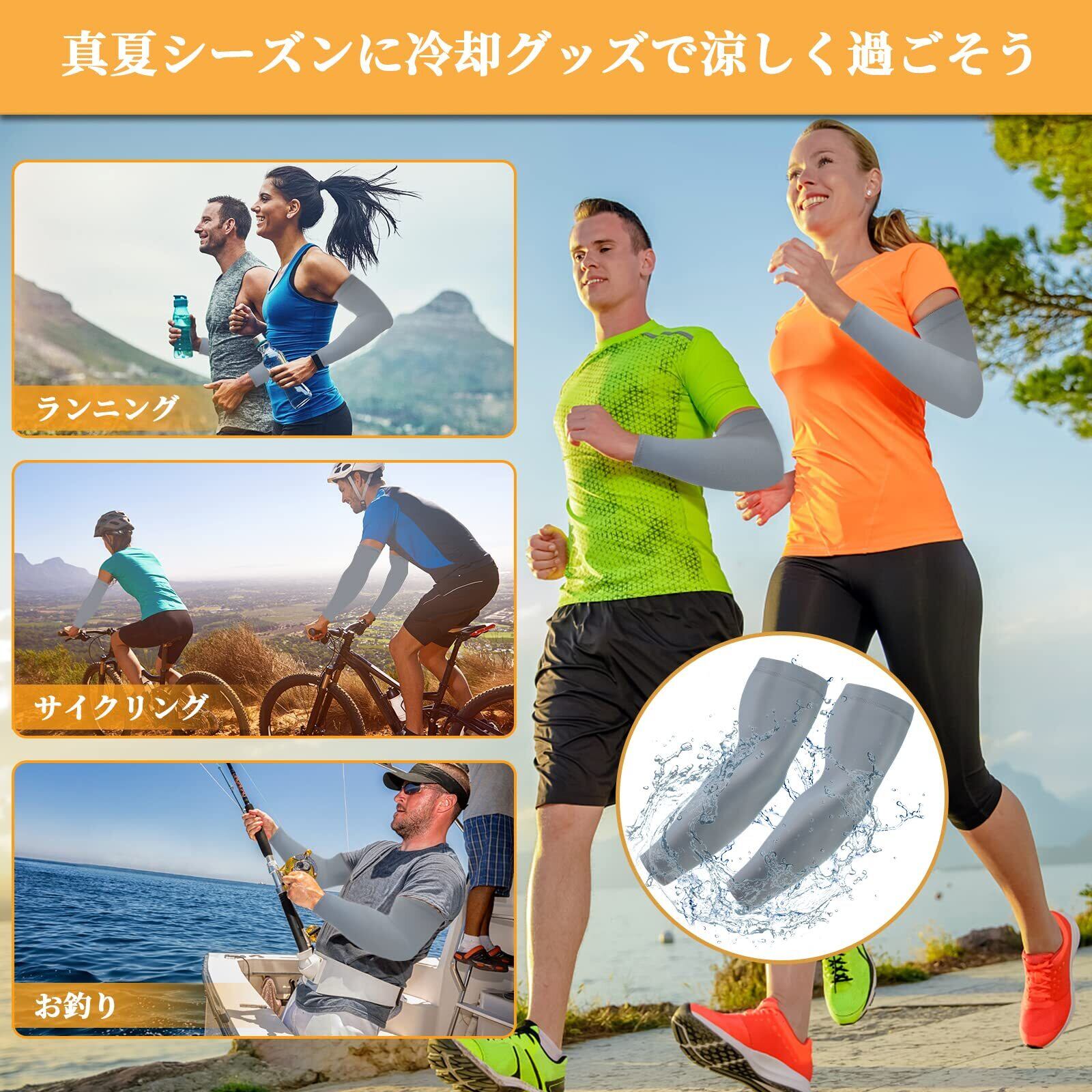 3、【振ると冷える素材】:水や汗で濡れると気化熱の作用により冷却効果があり、炎天下の時期にもクールを感じられる冷感アームカバーは、高い冷感機能を誇る「接触冷感素材」により、ひんやり涼しい着心地を実現した。