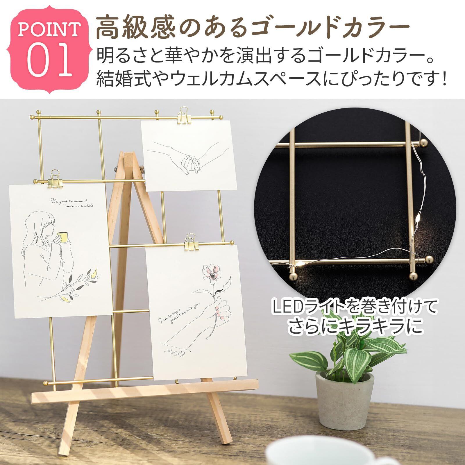 スタイリッシュで実用的なこのディスプレイスタンドは、アート作品や写真の展示に最適です。ナチュラルな木製フレームとゴールドカラーのワイヤーグリッドが美しく調和し、モダンでエレガントな雰囲気を演出します。クリップ式のホルダーが15個付いており、様々なサイズの作品を自由にレイアウトできます。折りたたみ式のA型フレーム構造で、収納も簡単。アーティストやクリエイター、ホームデコレーションを楽しむ方に最適なアイテムです。展示会やギャラリー、オフィス、自宅など、様々な場所で活用できます。木製フレームの温かみとメタリックな要素が織りなす上質なデザインは、どんなインテリアにも自然に溶け込みます。