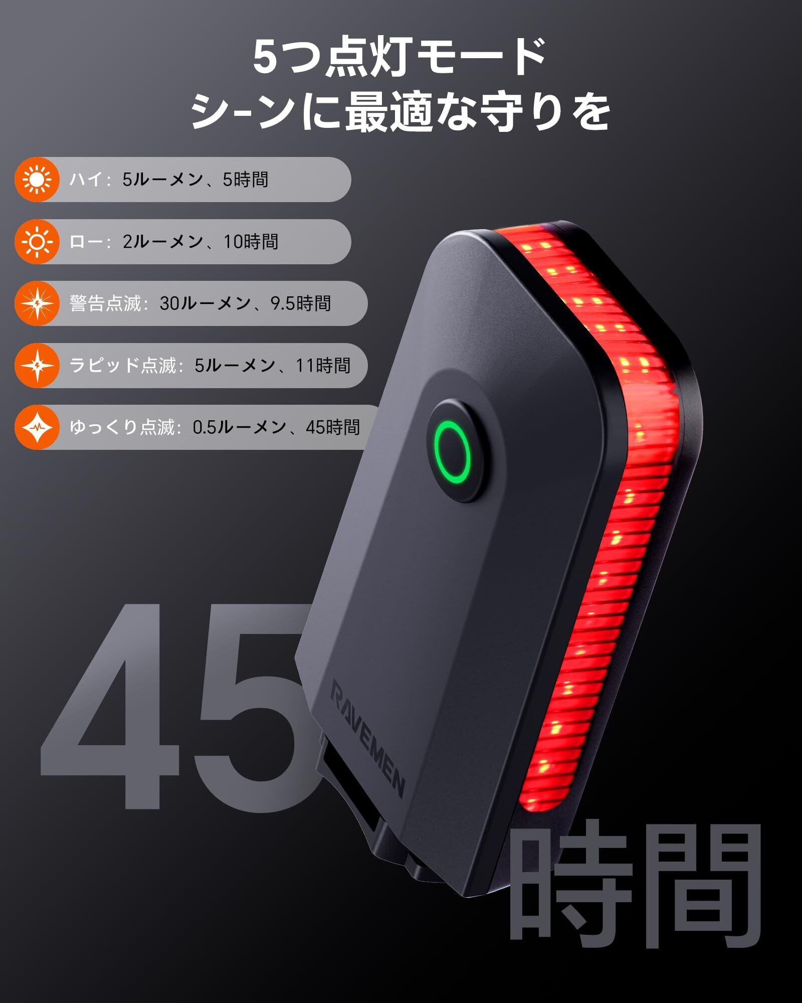 RAVEMEN CL01 テールライト 自転車 リアライト USB-C充電 300度視認 ブレーキセンサー 自動オンオフ IPX6防水 最大45時間連続点灯 軽量 昼夜兼用 PSE認証済 直営 日本語説明書付き