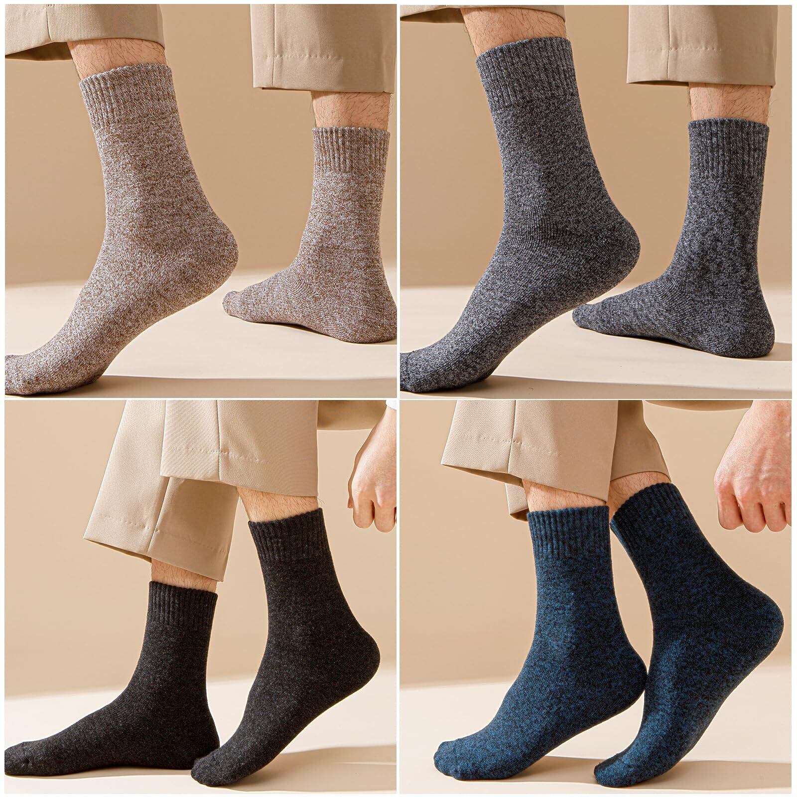 【厚くて暖かいウール靴下】MOSOTECH 5ペアの メンズサーマル靴下は、厚く、柔らかく、快適で、通気性、耐摩耗性、吸汗性に優れた高品質のウールとポリエステルの混紡で作られています。 メンズの厚手の靴下は各ペアが厚く、寒い冬に十分暖かいです。 フリーサイズでほとんどの メンズにフィットします: サイズ: 24-28cm。