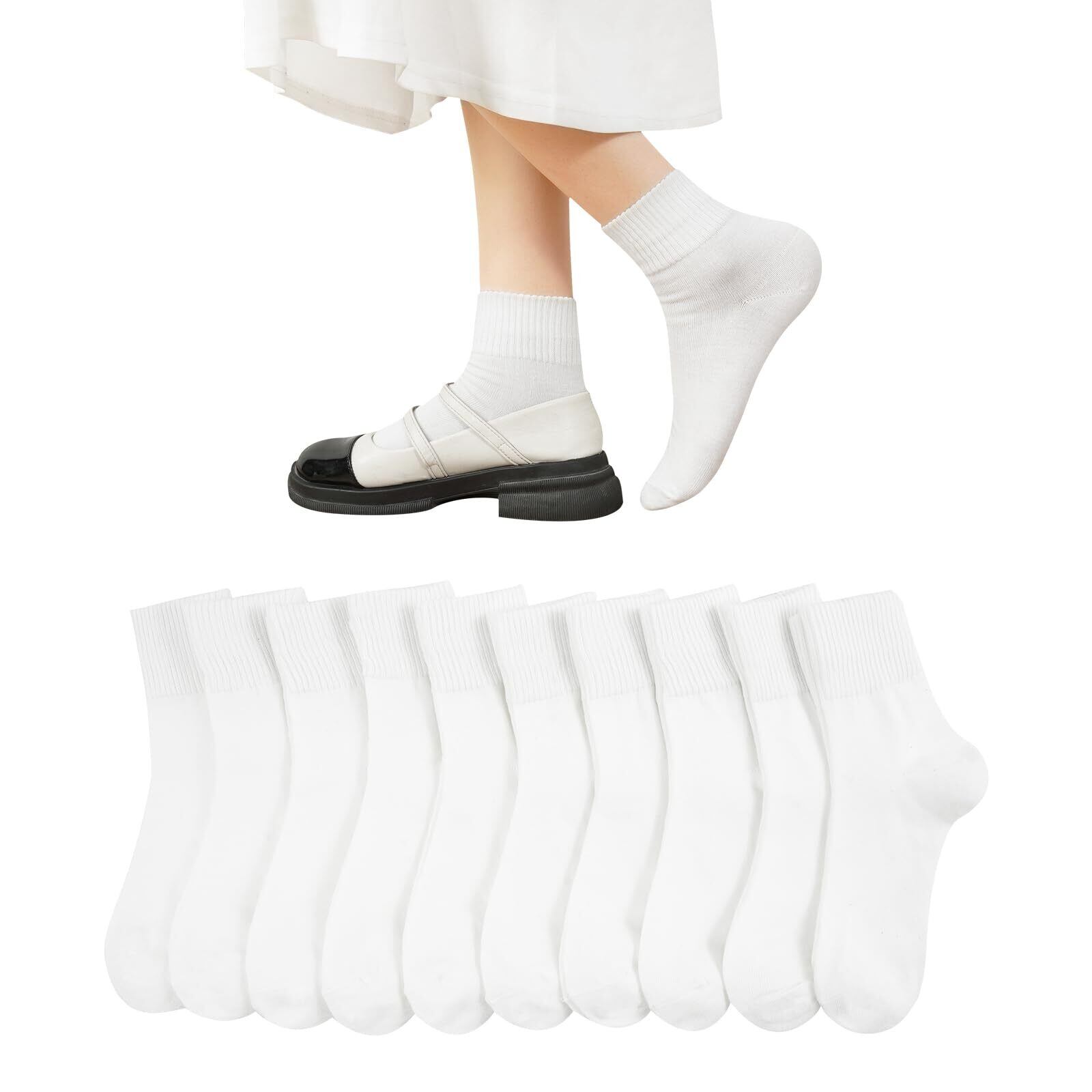 【yazon靴下 レディース 白 商品仕様】レディース用のまとめ買い10足セットの白ソックス。素材:80%綿+ボリエステル+スパンデックス。サイズ:22-25cm。伸缩性良いフリーサイズで大部分の日本女性の足に適用大きめ靴下。厚さ:厚手と薄手の中間厚さ。季節対応:四季。春秋の着用に最適が、夏は蒸れにくい、冬にも保温靴下。パーケージ内容:白色10足セット。普段の生活に活躍する白のクルーソックス、制服 スクール 高校生 婦人通勤通学ファション小物です。また同色のセットは、穴が空いたり、片足をなくしても、代替え出来るので重宝して人気です。