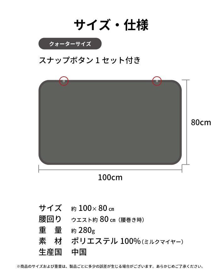 【サイズ】約100×80 [cm] 【腰回り】ウエスト約80 [cm](腰巻時) 【重量】約280g 【素材】ポリエステル100% (ミルクマイヤー) 【生産国】中国