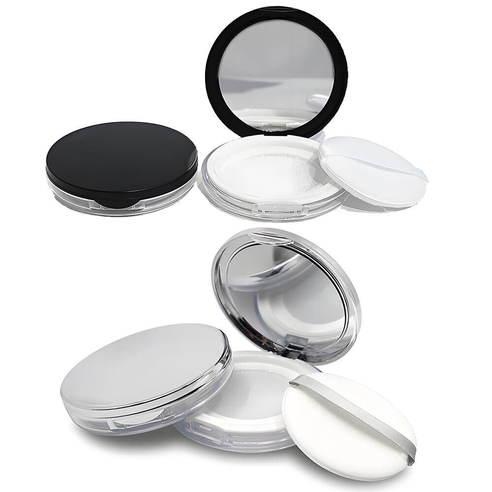 1.【2色セットの便利なパウダーケース】ブラックとシルバーの2個セット。どちらもミラー&パフ付きで、外出先での化粧直しにとても便利です。 2.【こぼれ防止のメッシュケース設計】ネットフィルター構造により、粉を入れる際に飛び散りを防止。しっかりロックできるパウダーケースで、バッグの中でも安心して持ち運べます。 3.【軽量&ポータブル設計】超薄型のルースケースで、フェイスパウダー UVにも対応。コンパクトパウダーケースとしても使え、化粧ポーチやポケットにスッキリ収まります。旅行やお出かけにぴったりです。 4.【収納機能付きで使いやすさ抜群】パフをケース内に収納でき、別に持ち歩く必要はありません。内蔵ミラーで、いつでもどこでもメイクチェック・リタッチが可能なミラーパウダー仕様です。 5.【多用途&詰め替え可能なパフケース】ルースパウダーのほか、チーク・ベビーパウダー・シューズパウダー・ラメパウダーなど、さまざまな粉状コスメに対応。詰め替え容器・メイクパレット ケースとしても活躍します。