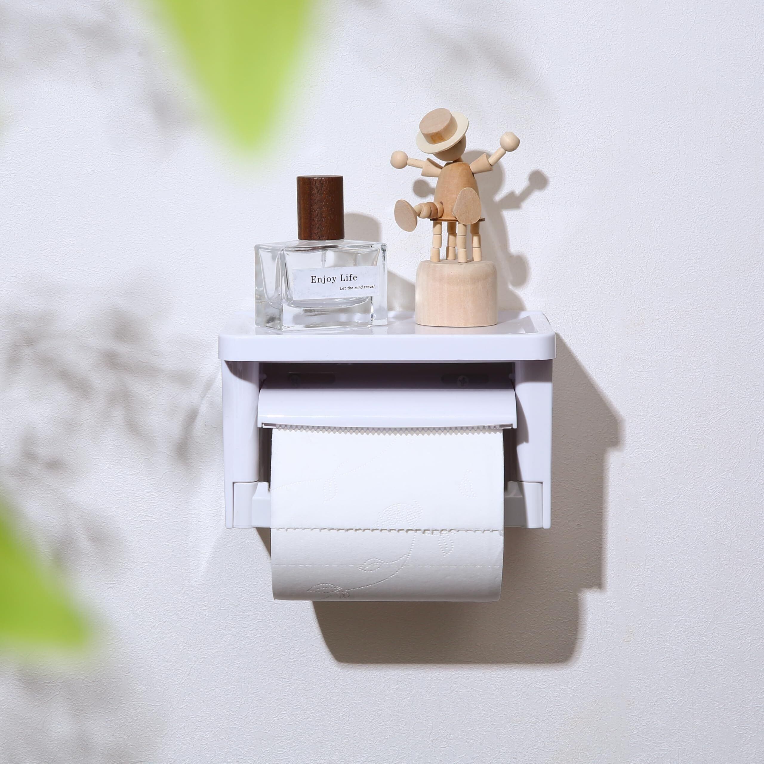 トイレットペーパーホルダー バスルーム ABSプラスチック楠竹木製製 切断機能付き DIY おしゃれ 2連 棚付き 賃貸対応 小物置き 簡単設置 補充楽 飾り棚 紙巻器 コンパクト設計 (ABSホワイト, シングル)