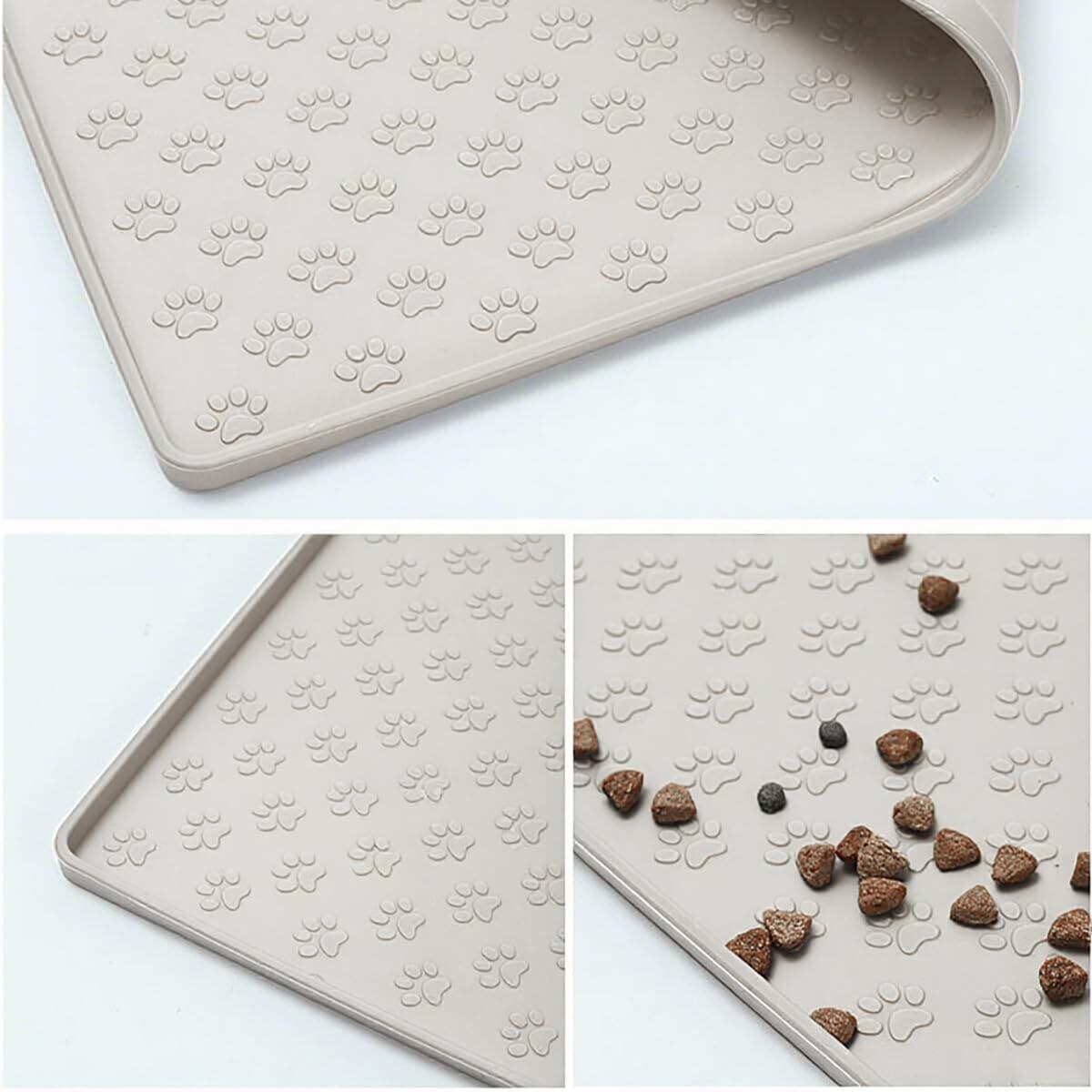 【パッケージ内容】ベージュ色のシリコン製ペットフードマット1枚入り - サイズは48×30cm/40×60cmの2種類から選択可能。折り畳み可能な形状とコンパクト設計で収納に場所を取りません。