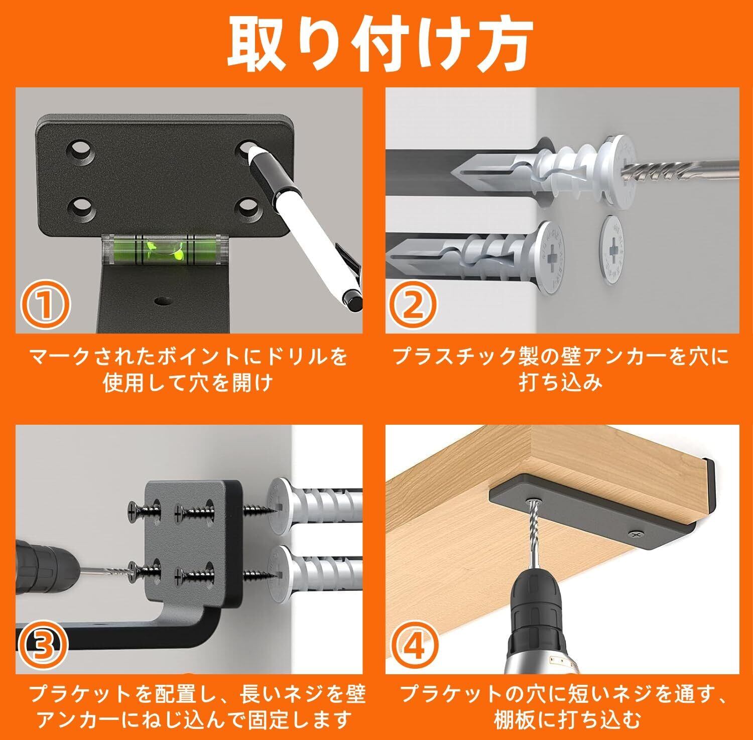 【簡単に設置出来】DIYが苦手な方でも簡単に取り付けます。パッケージには、付属のネジ、アンカーが付いておりますので、届いたらすぐに作業が出来ます。素人作業で設置してます。2つの棚受け金具が互いに平行で壁に垂直であることを確認する必要があります。
