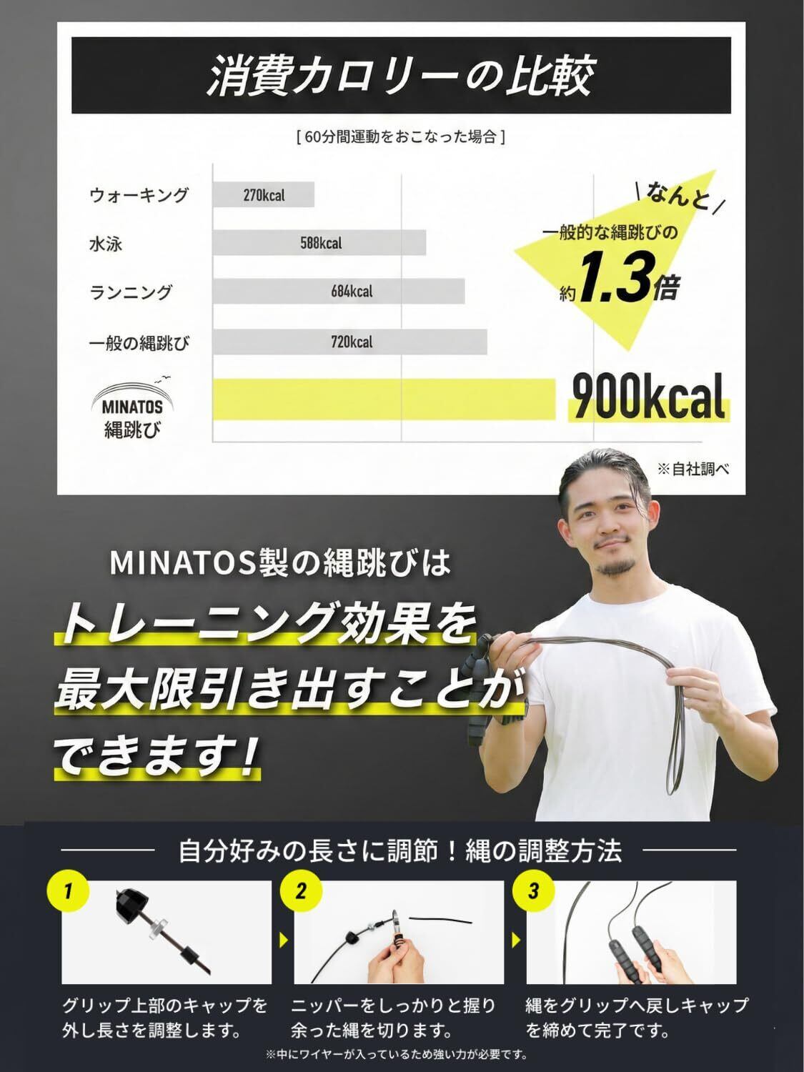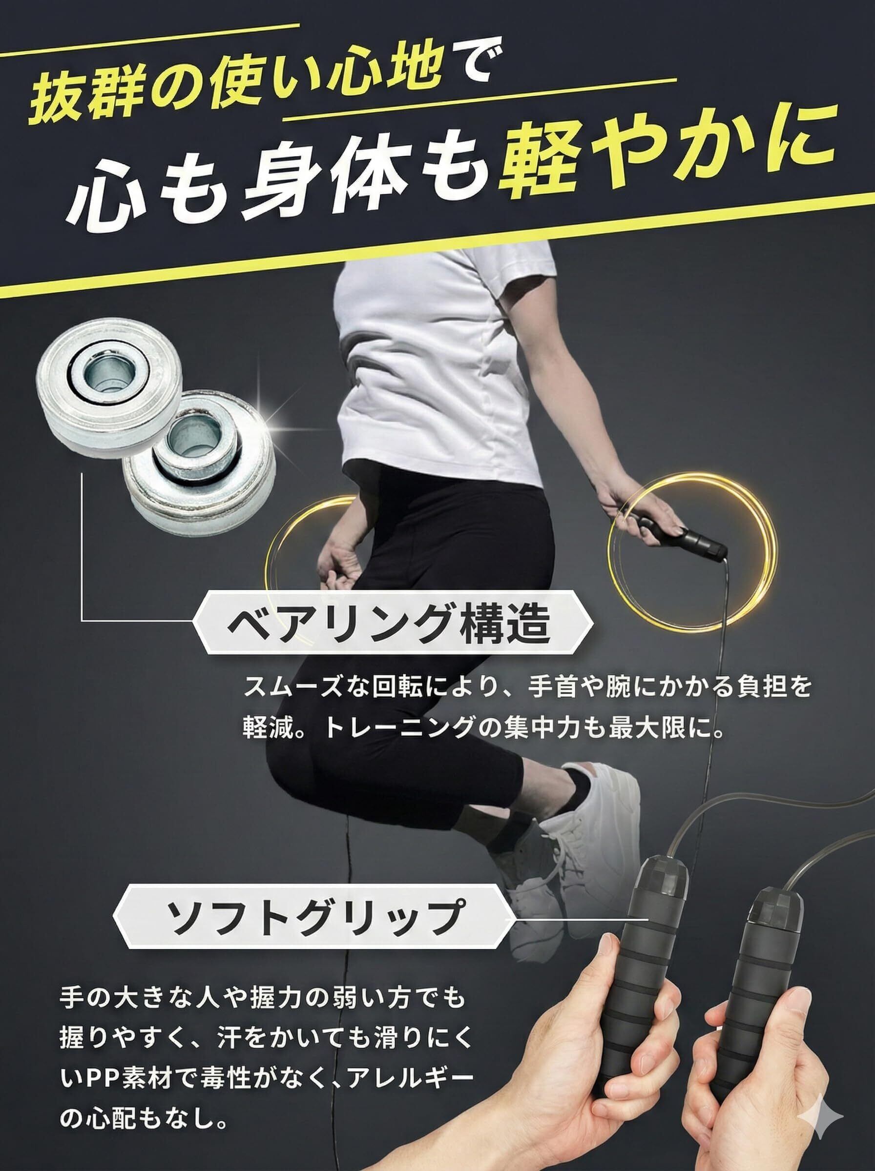 【パーソナルトレーナーと共同開発】1日10分で理想的な身体に。構造、素材、負荷の掛け方など、ワンランク上のフィットネス効果を追求。 【圧倒的カロリー消費を実現】グリップウェイトを用いることで負荷を増加させ、カロリー消費量を上昇させることに成功。通常の縄跳びよりもカロリー消費量が25%アップ。 【トレーニングに集中可能な設計】ベアリング構造によるスムーズな回転とソフトグリップによる握りやすさがフィットネスをサポート。抜群の使い心地で心も身体も軽やかに。 【老若男女どなたでも使用可能】縄の長さ調整ができるため、幅広い年齢・体格の方にトレーニング用具としてお使い頂けます。 【安心安全の日本人スタッフ対応】日本国内にて検品、梱包、出荷を実施。万一不具合があった場合も、日本人スタッフが徹底サポート。