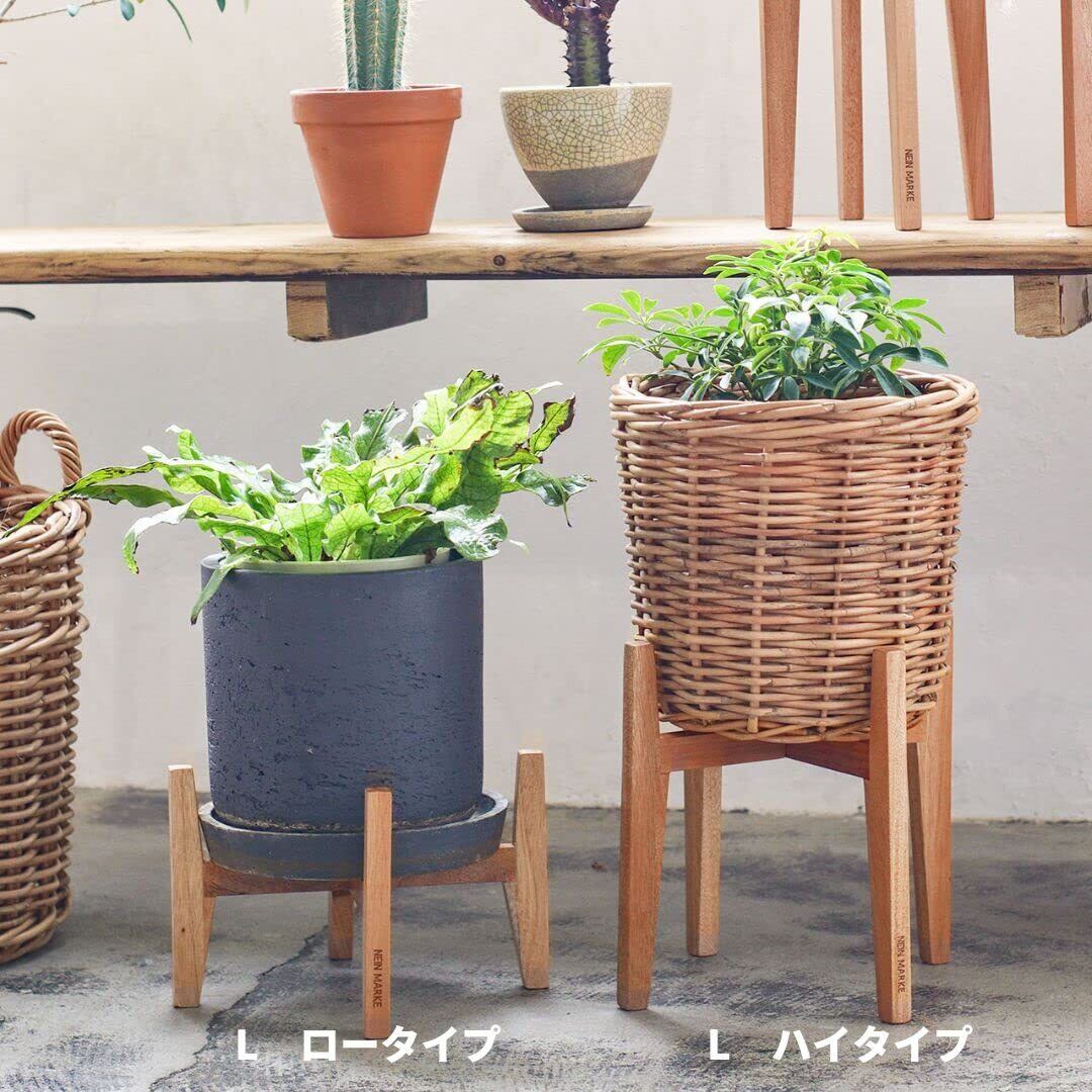 マホガニーを使った木の温もりを感じるポットスタンド。直径20cmの鉢サイズまで対応のナチュラルなポットスタンドです。色々なテイストのインテリアに馴染むシンプルなデザイン。重心が低いロータイプは、どっしりとした鉢や植物にぴったり。脚には「NEIN MARKE」の焼印が印字されています。マホガニーは軽量で丈夫な素材。使い込むことで色味も変化していき、経年の変化もお楽しみ頂けます。脚は組み立て式のため、付属のネジで中央を固定してご使用ください。アラログのバスケットとも相性抜群。