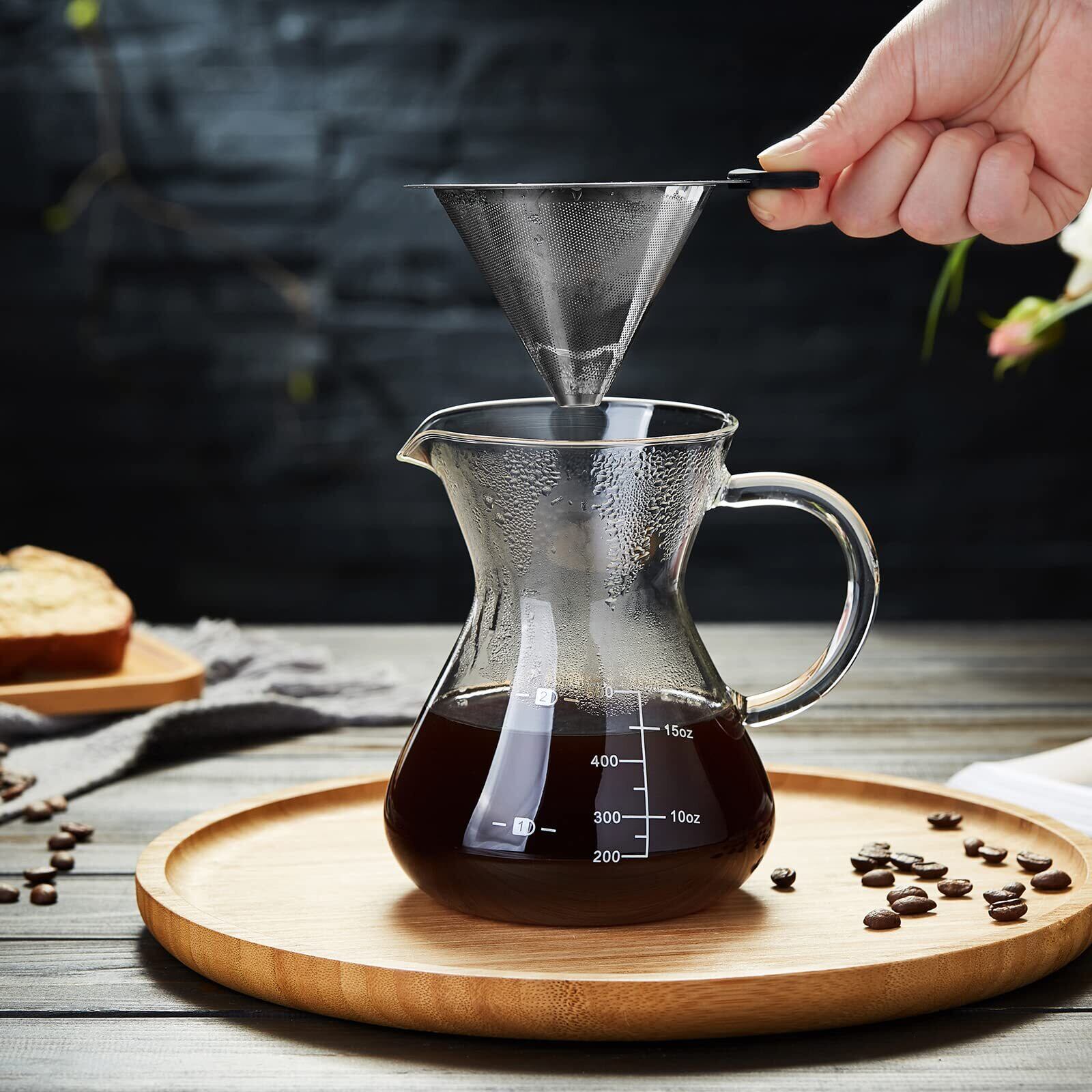 【使いやすさ】:このガラス製コーヒーは抜群の使い勝手を誇ります。コーヒーサーバーの上にステンレスフィルターを置き、お気に入りのコーヒーを入れて、ゆっくりと回しながらお湯を注ぐだけで美味しいコーヒーを楽しむことができます。しかも、コーヒーサーバーの素材は滑らかなガラスであり、ステンレスフィルターはお手入れも簡単。お掃除の心配も解決されるでしょう。