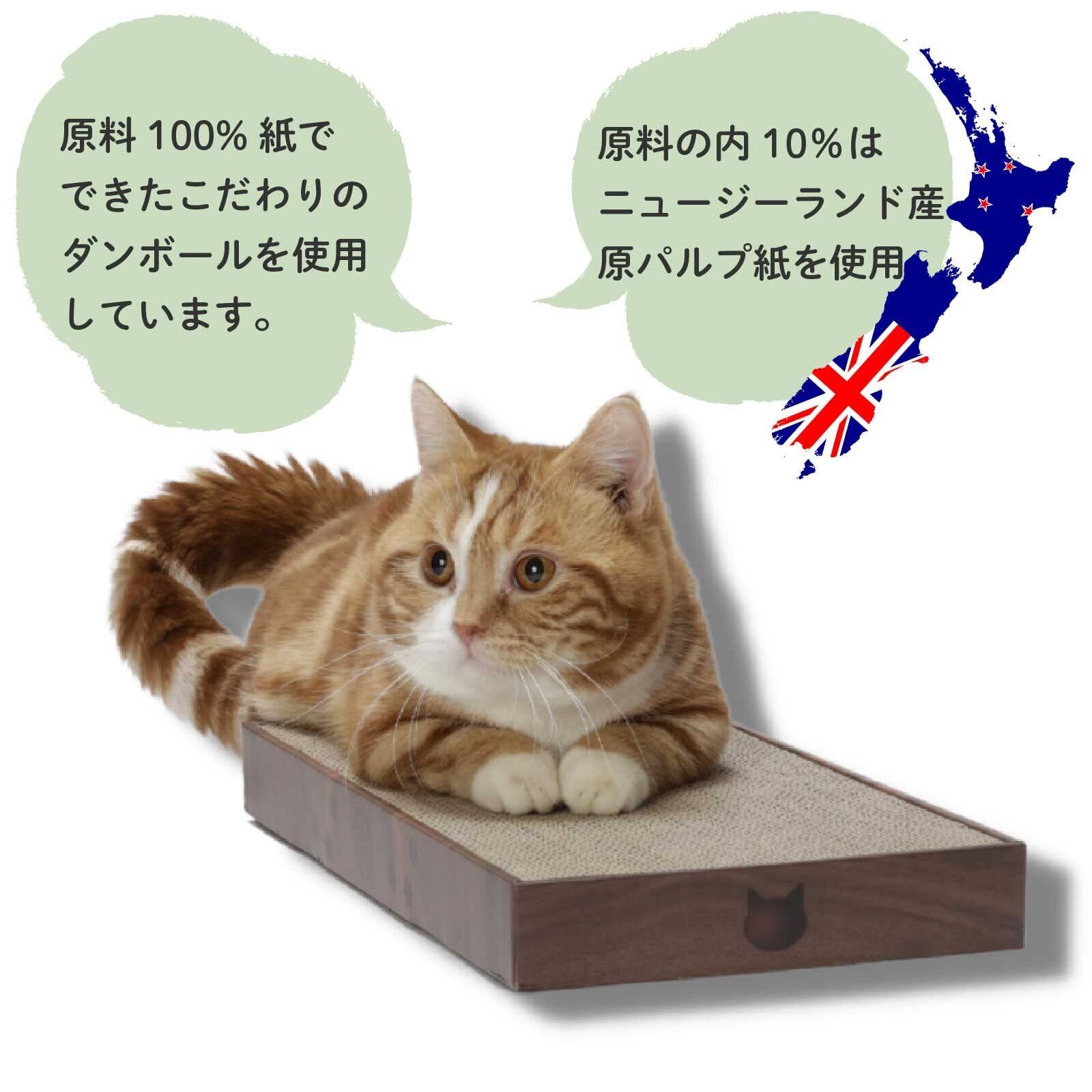 【こだわり抜いた原材料】つめとぎ部分に使用しているダンボールは、原料の100%が紙。 内10%はニュージーランド産原パルプ紙を使用。大切な猫に使用するつめとぎなので、品質にはとことんこだわりました。 ダンボールを貼り合わせる糊は植物由来の糊を使用しています。