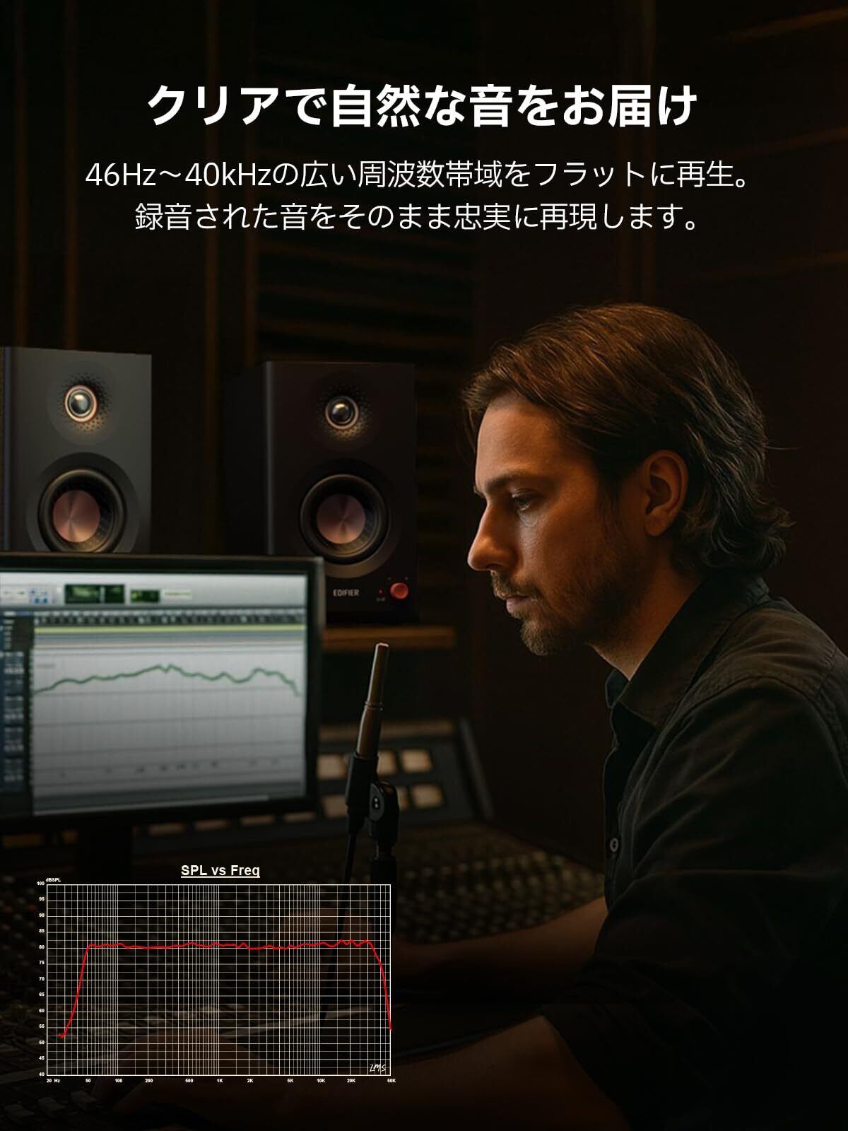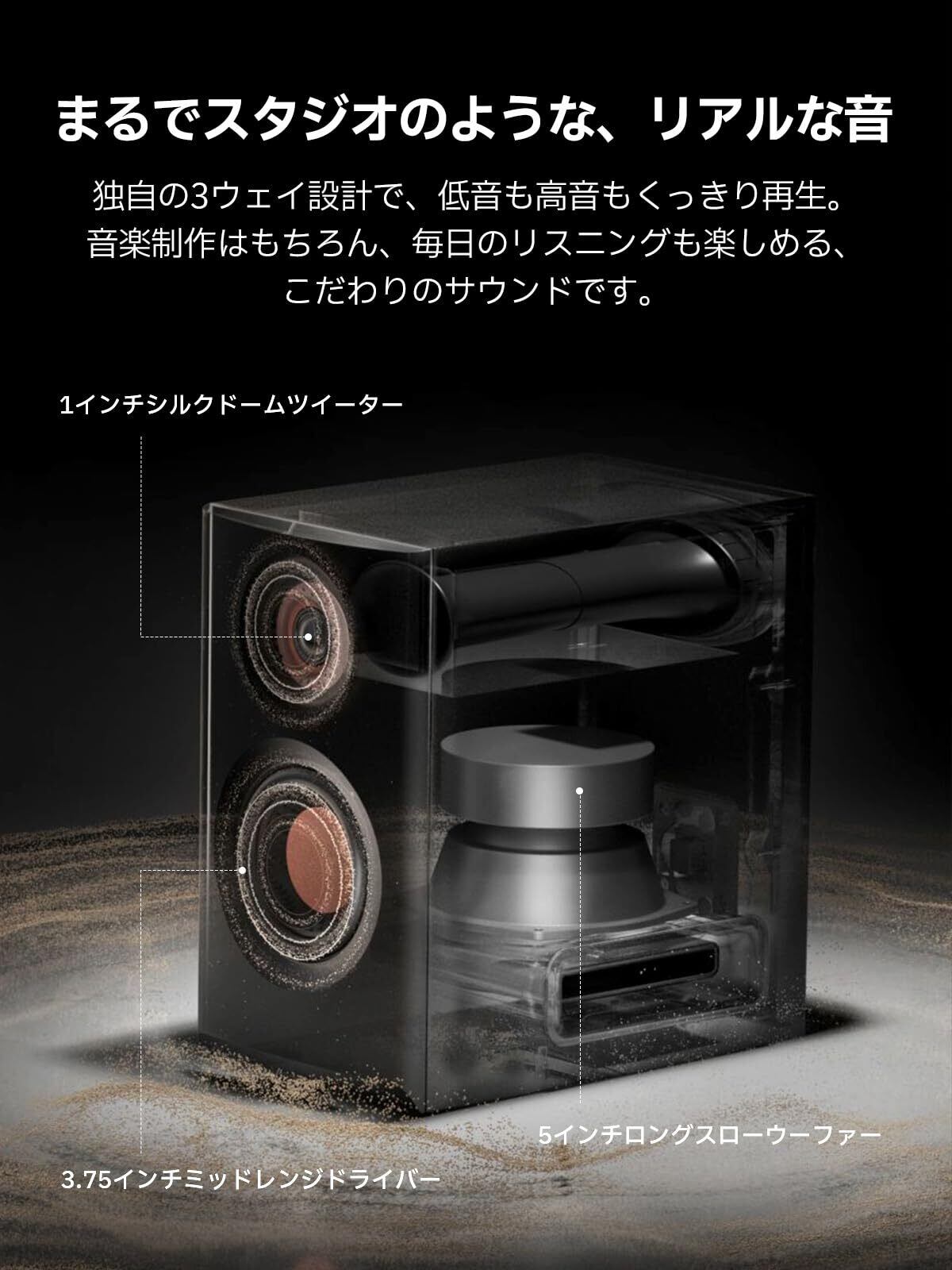 まるでスタジオのような、リアルな音:5パワフルなルームフィリング性能インチベース、3.75インチミッド、1インチツイーターの3ウェイスピーカーで46Hz~40kHzのスタジオ品質サウンドを実現。