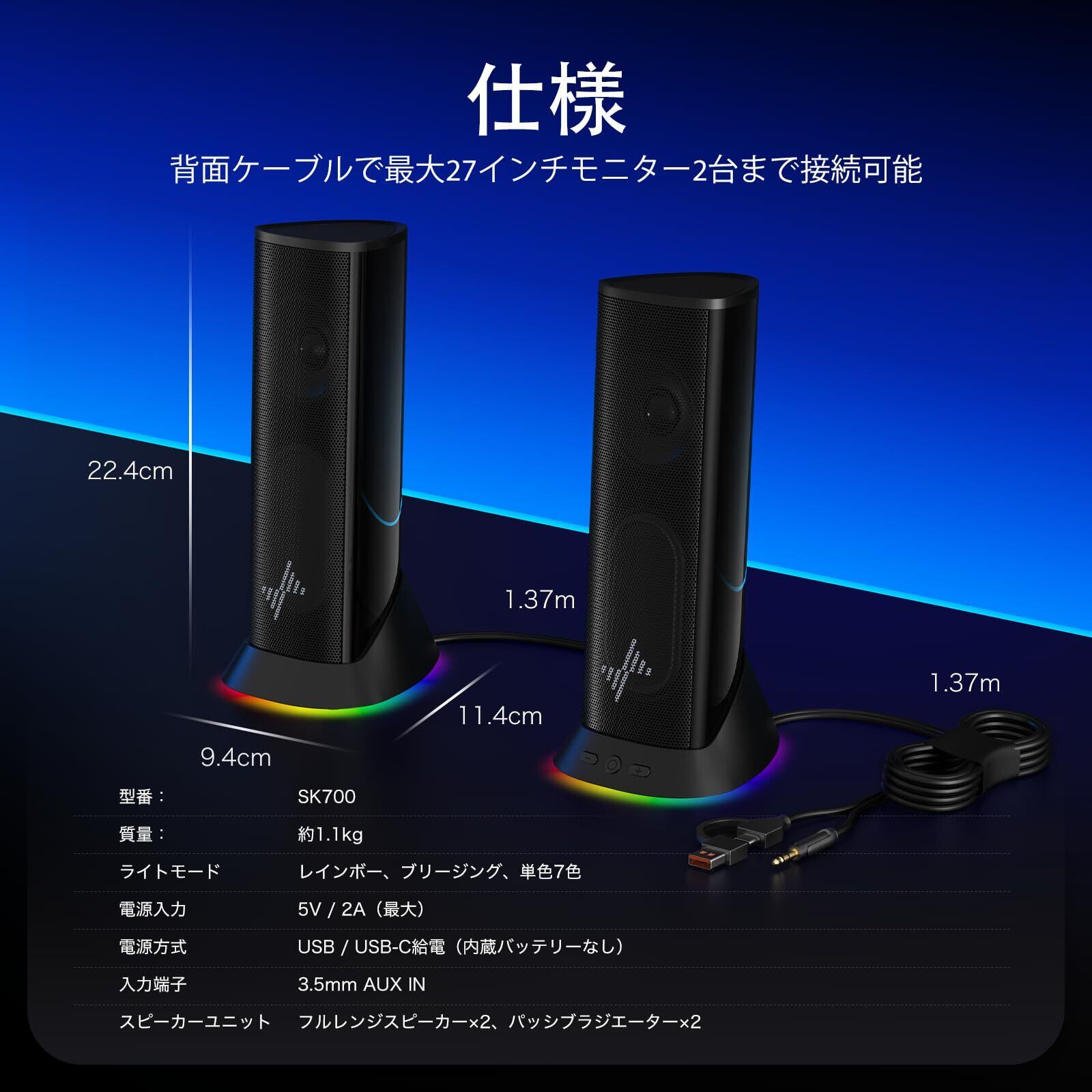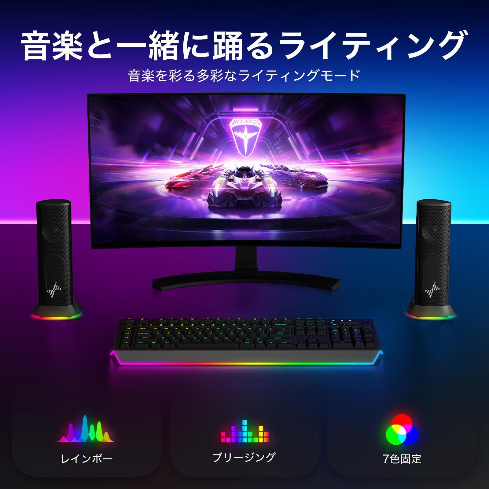 【多彩なライティング搭載】レインボー・ブレスなどの動的エフェクト+7色固定カラーでゲーミングPCスピーカー・デスクトップスピーカー環境をおしゃれに演出。モニター用スピーカーとしても最適。