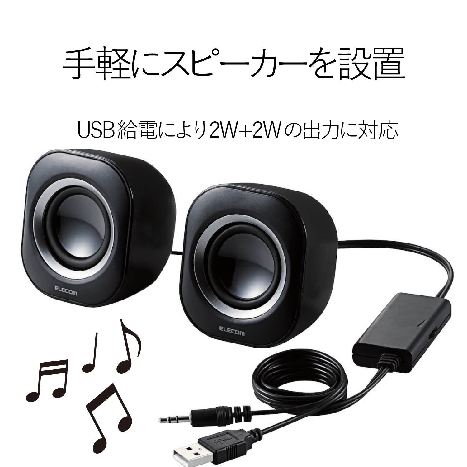 ■実効最大出力4.0Wの2.0chステレオスピーカです。パソコンなどのUSB端子からの給電で、ステレオサウンドを手軽にお楽しみいただけます。