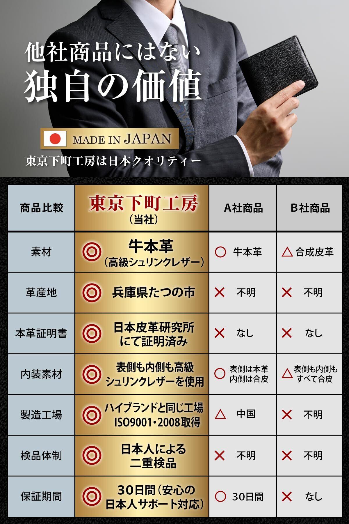 【品質は折り紙付き】柔らかくて傷がつきにくい高級シュリンクレザーを採用。シボ革がしっとりと手になじみます。耐久性が高く、末永く使える本革二つ折り財布です。【本革証明取得済み】「日本皮革研究所」の検査にて本革であることが認められた商品です。【ISO9001・2008取得工場】ハイブランドの革小物も手掛ける工場で製造しました。
