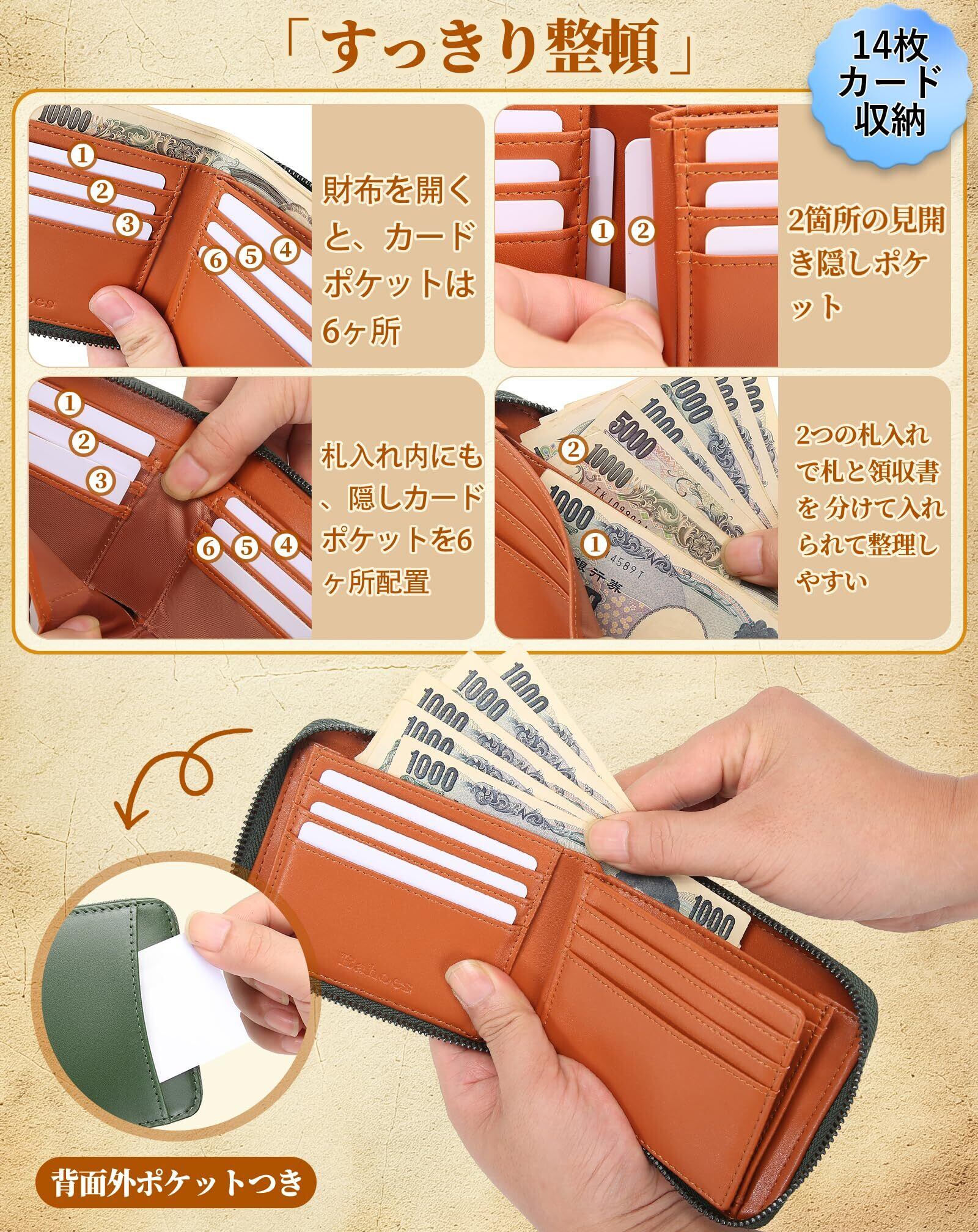 【使いやすさを重視した二つ折り財布】収納力と使いやすさのバランスを考えた二つ折りデザイン。カード・紙幣・小銭を整理しやすく、日常使いからビジネスシーンまで幅広く対応します。シンプルで落ち着いたデザインは、長く安心してお使いいただけます。【日本円に合わせた収納構造】紙幣は折れにくく、カード類も取り出しやすいレイアウト。普段使いに必要な収納を無理なくまとめられるため、使い勝手の良さを実感できます。