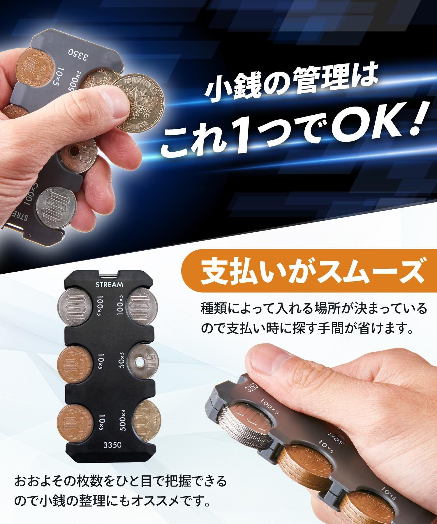 【スマートな小銭入れ】これひとつで小銭管理は完璧!片手でコインが取り出せる、スリムで軽量な便利コインホルダー。 各コインは種類ごとに決まった場所に収納されているので、支払い時に必要なコインをすぐに取り出せてとてもスムーズです。