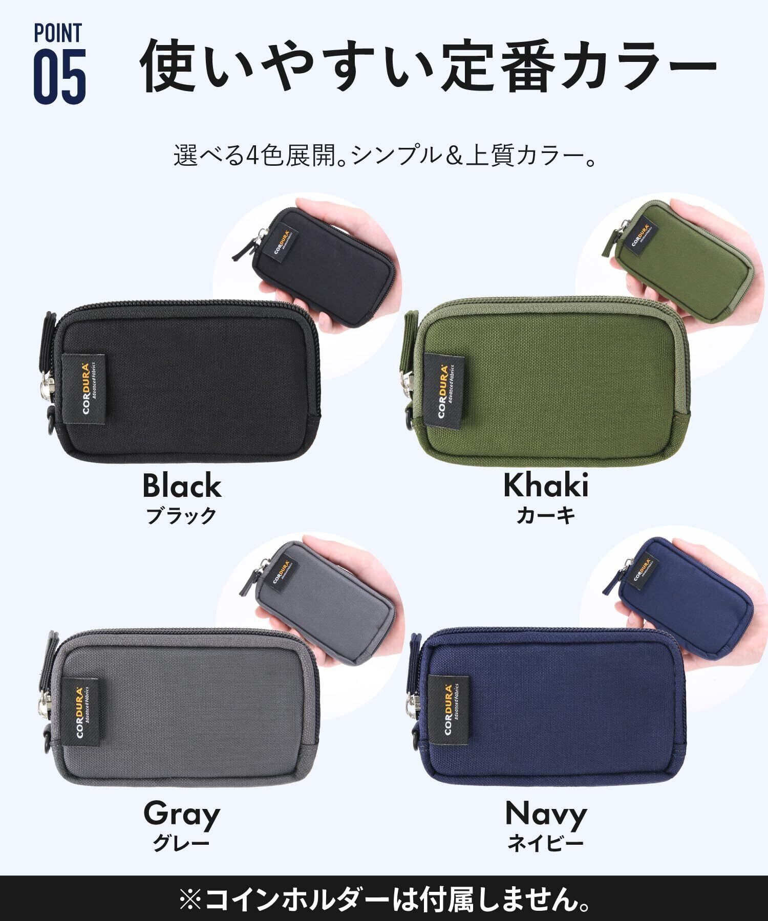 【スペック】サイズ:11.5cm×7cm×1.8cm 素材:ナイロン 仕様:内側ポケット×4(コインホルダー使用時は最大5枚のカードが収納可) Made in PRC、カラーバリエーション:ブラック・ネイビー・グレー・カーキ