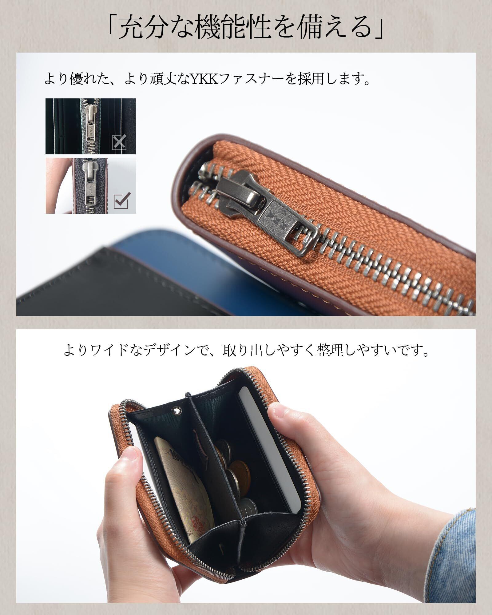 「YKKファスナーで安心」YKKファスナーを強化し、より丈夫で大きなファスナーを使用して、開け閉めもしやすく、製品の耐久性を向上させ、長寿命の使用を確保いたしました。L字型のファスナーとWマチのデザインを使用して、小銭が飛び出しません。