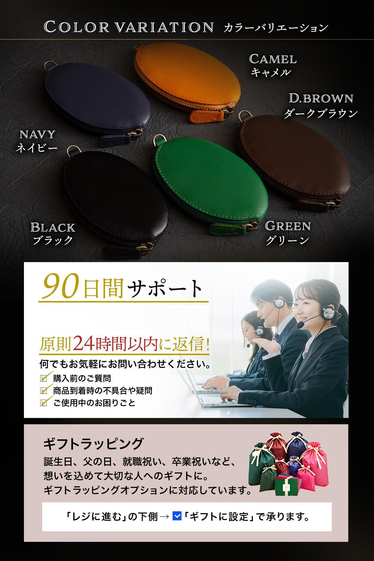 【サイズ】幅11.5cm×高さ6.8cm×厚さ1.5cm / 【重量】約20g / 【収納力】小銭30枚程度、お札5枚程度 / 【カラー】5色(ブラック、ダークブラウン、ネイビー、キャメル、グリーン)