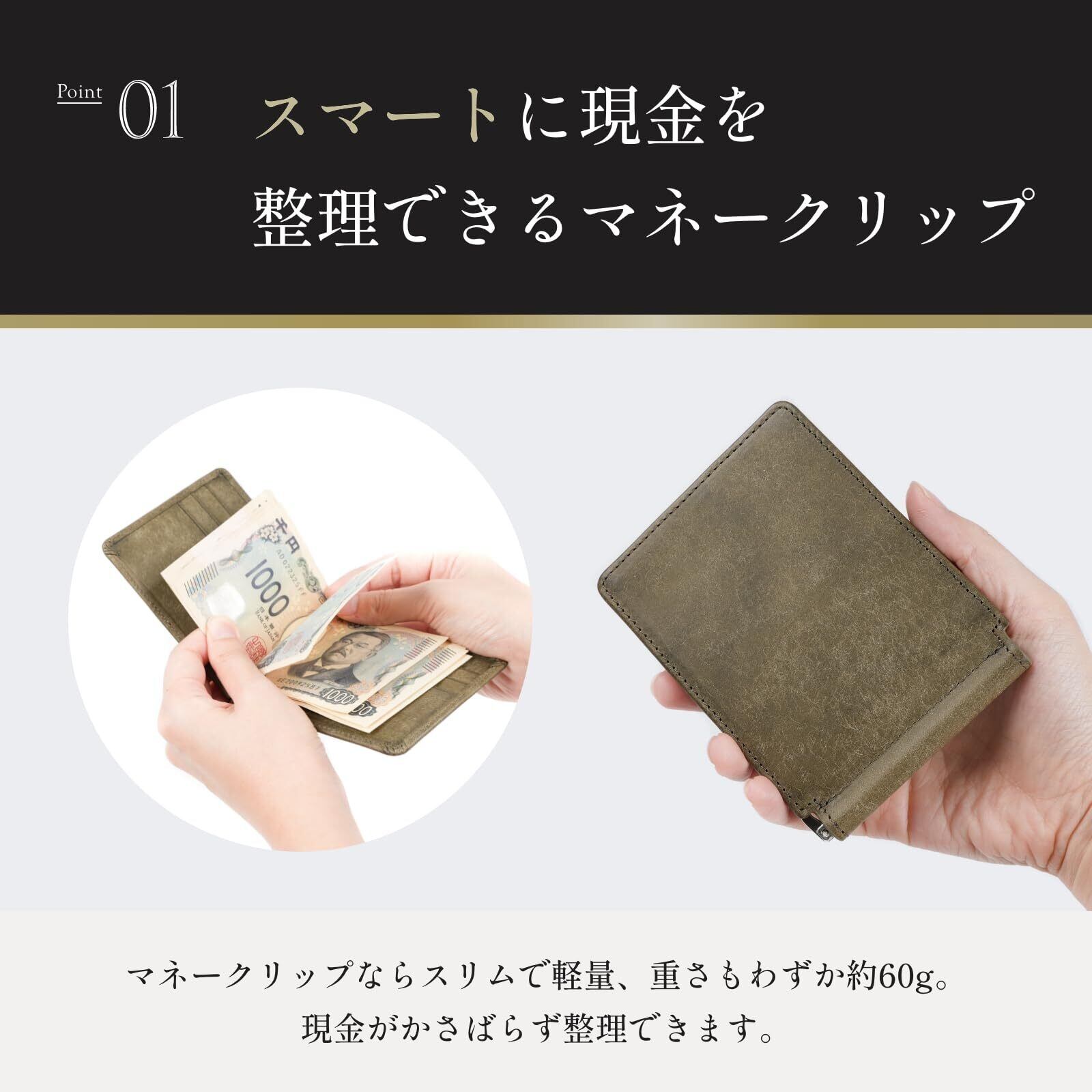 重量:約63g。カードやお札を収納をしても、薄型です。マネークリップは、スマートに使いたいという方も多いので、この薄さであればズボンやスーツの内ポケットに入れても邪魔になりません。