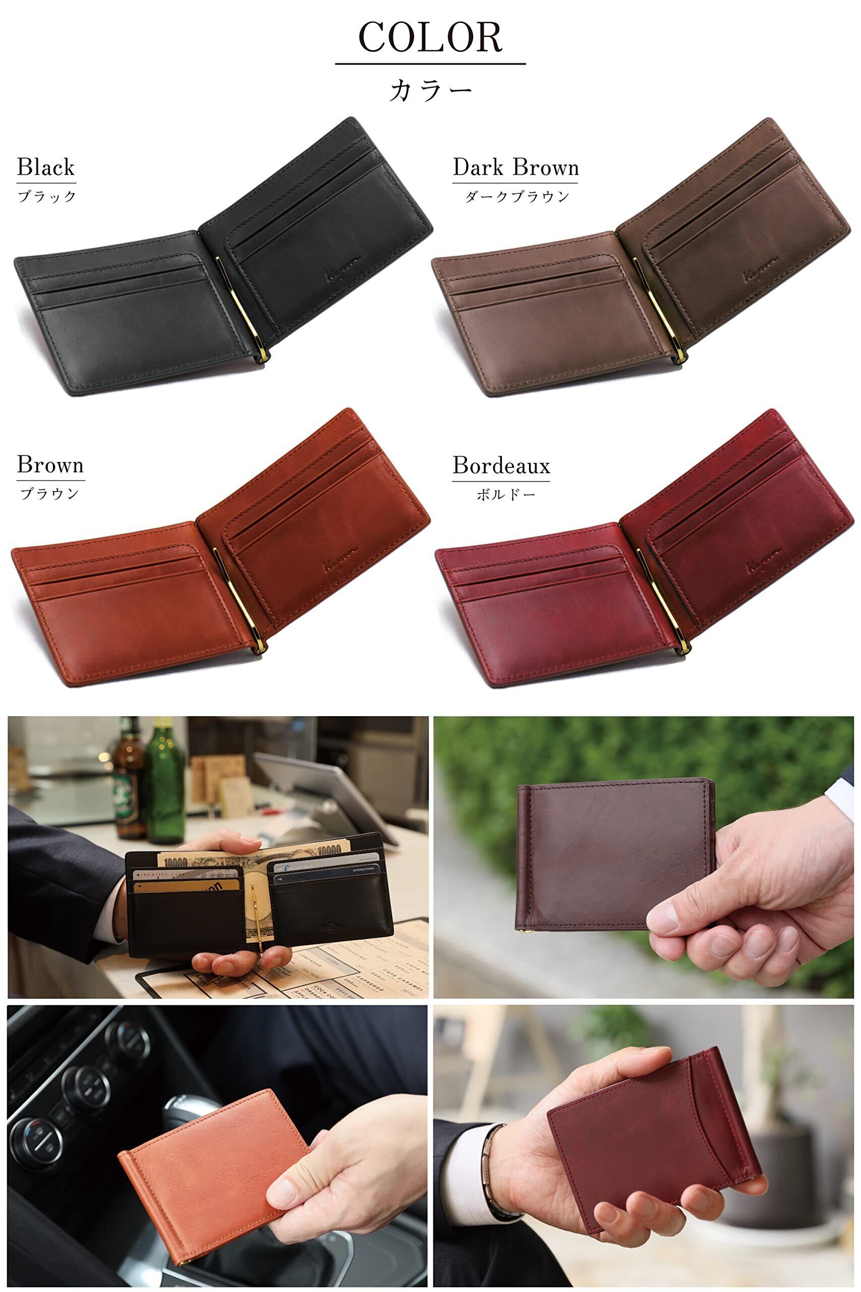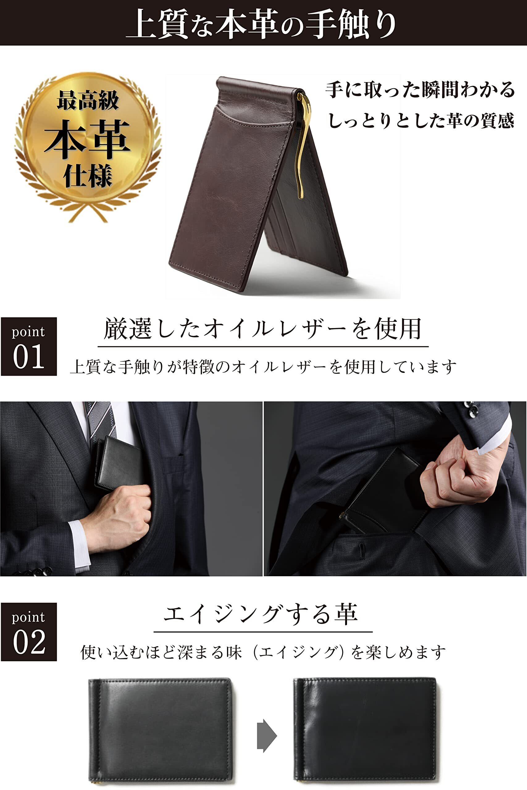 【本物のオイルレザー(牛本革)を贅沢に使用】外側・内側ともにオイルレザーを使用。本革ならではの優しい手触りと高級感があります。本革の特徴である「使うほど味と深みが出る」(エイジング)で、2年、3年とお使いいただくことでアナタだけのマネークリップができあがります。キズに強く、細かなひっかき傷も、通常のポケットの出し入れや手でこするなどの軽い摩擦でキズが徐々に目立たなくなります。クリップはゴールドとシルバー2本付属で、革の色にお好みの色合せでお使いいただけます(お届け時、ゴールドを本体にセットしています)。引き出しタイプのギフトボックスに入れてお送りしますので、大切な方へのプレゼントにも大変お喜びいただいております。
