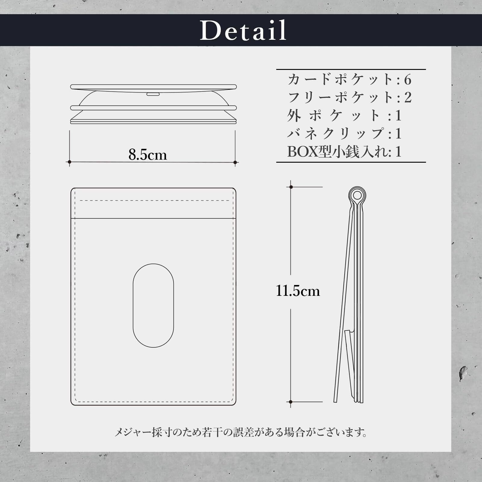 仕様:カード入れ x 7、フリーポケット x 2、札クリップ x 1、BOX型小銭入れ 素材:高級本革(牛)、サイズ:約 横11.5cm x 縦8.5cm