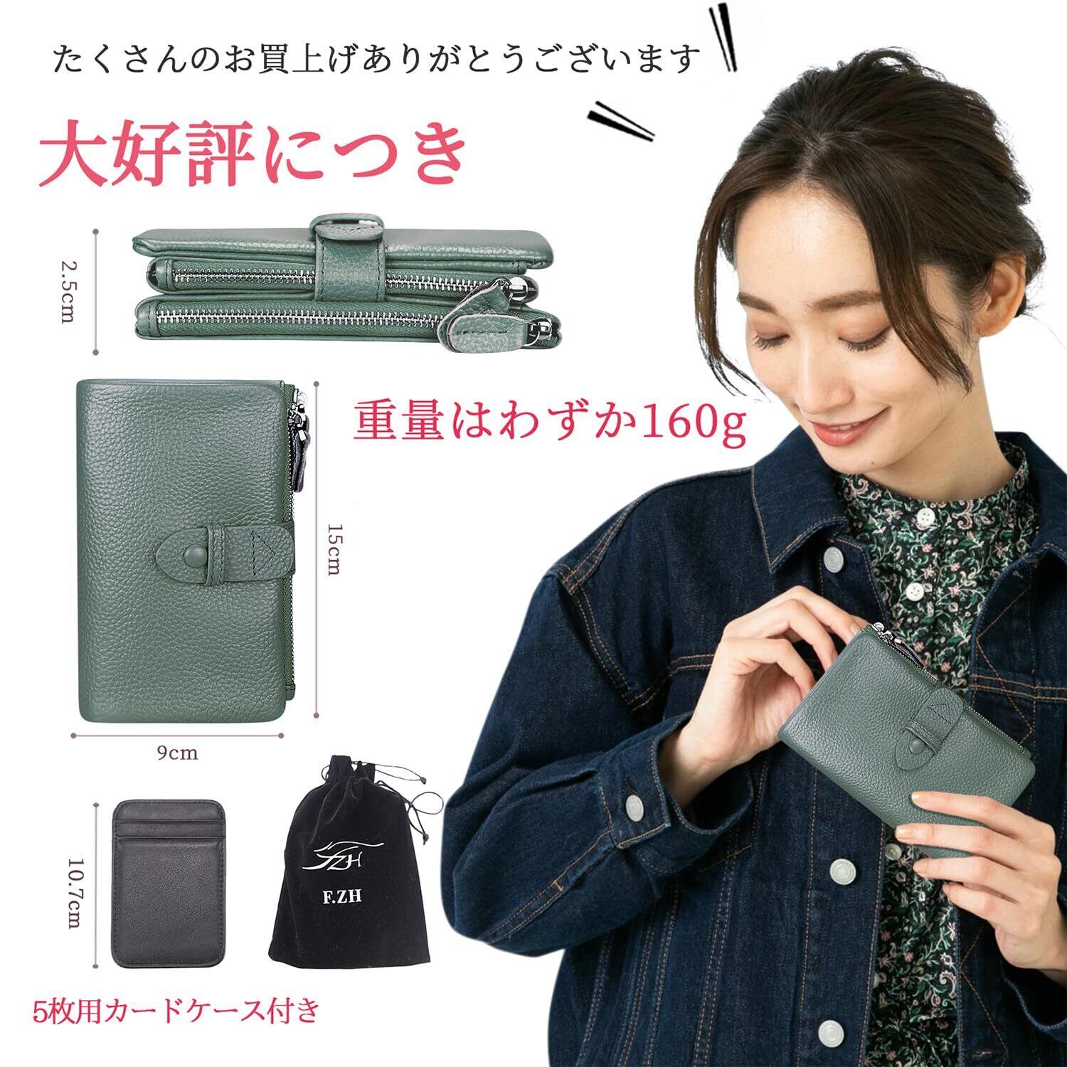 [F.ZH] 二つ折り財布 レディース 短財布 本革製 小銭入れ付 18カード入れ お札入れ 大容量 小型 軽量 多機能 ダブルボタン ダブルファスナー クリスマス 母の日プレゼント 自分用もプレゼント用も最適 (ダークグリーン)
