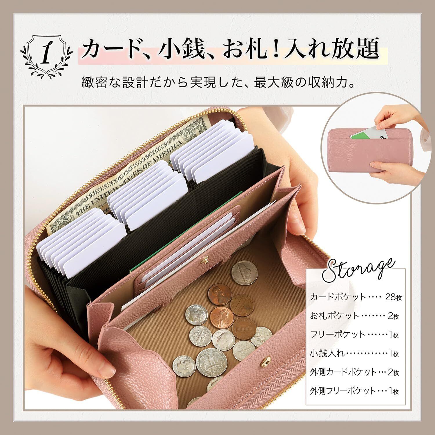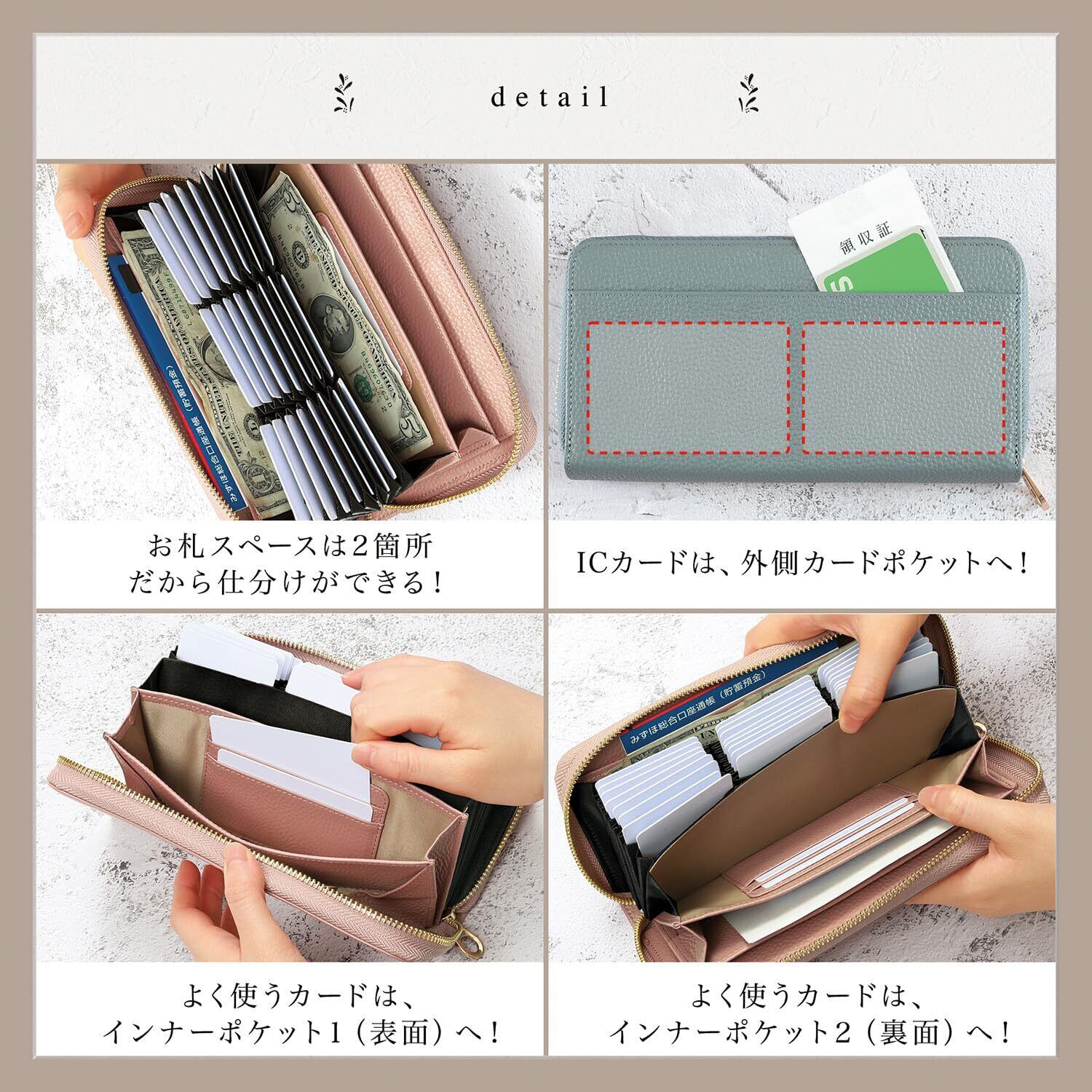 【 サイズ 】縦20.5 × 横11 × 厚み3.2cm 【 重さ 】 約265g 【 収納力 】 カードポケット×30、お札スペース×2、フリースペース×2、小銭スペース×1 【 素材 】 牛本革 トップグレイン シュリンクレザー(植物タンニン鞣し) 【 カラー 】 ロイヤルブラック・グレージュ・レトロキャメル・ダークネイビー・ディープグリーン・スワニーピンク・スカイブルー・シャンパンゴールド