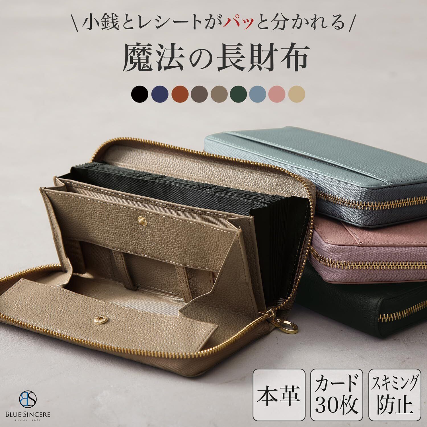 【 ブルーシンシアとは? 】 「ブランドの発展とともに、バングラデシュの社会問題を解決する」という理念を掲げ、 バッグや財布を自社工場のバングラデシュの職人たちと、その土地の素材の可能性を追求し、 先進国でも通用する高機能なプロダクトを生産しています。 【 使いやすさ抜群!大容量ギャルソンウォレット 】 「パッと見たときにすぐにカードを取り出せる」「容量も妥協しない、しっかりお札や小銭も入る財布を探している」そんなお声から、収納力を兼ね備えたじゃばらギャルソン長財布がBLUE SINCERE(ブルーシンシア)から登場しました。 従来のよくあるギャルソンウォレットとサイズはほぼ変わらないにも関わらず、財布の設計を見直したことによりカード収納ポケットを30枚に拡張。蛇腹式なのでサイフを開けたらパッと一目瞭然。 週末のデートや1泊2日の旅行から、フォーマルシーンなど色々な場面でこの財布をお使い頂くことができます。 収納力を持った財布をお探しのあなたにピッタリなサイフです。 【 今の時代に欠かせないスキミング防止機能 】 近年急速にキャッシュレス化が進み、カードで支払いできるお店も増えてきて、カードでの支払いが主流になって来ました。 カードで簡単に支払いができる便利な世の中になった反面、スキミングという恐ろしい犯罪も増えて来ました。 スキミングとは、専用の機械を使って、クレジットカードやキャッシュカードなどの大切な情報を盗み取る犯罪です。 近づいただけで知らない間に大切なカード情報を盗み取られてしまう危険性があります。 そんな恐ろしいスキミングの被害からあなたを守るべく、スキミング防止機能を搭載しました。 特殊なフィルムを織り込むことで、外部からの電波をシャットアウトします。 カードをカードポケットに入れておくだけでスキミングの被害を防ぐことができます。大切なカード情報をしっかり守ります。