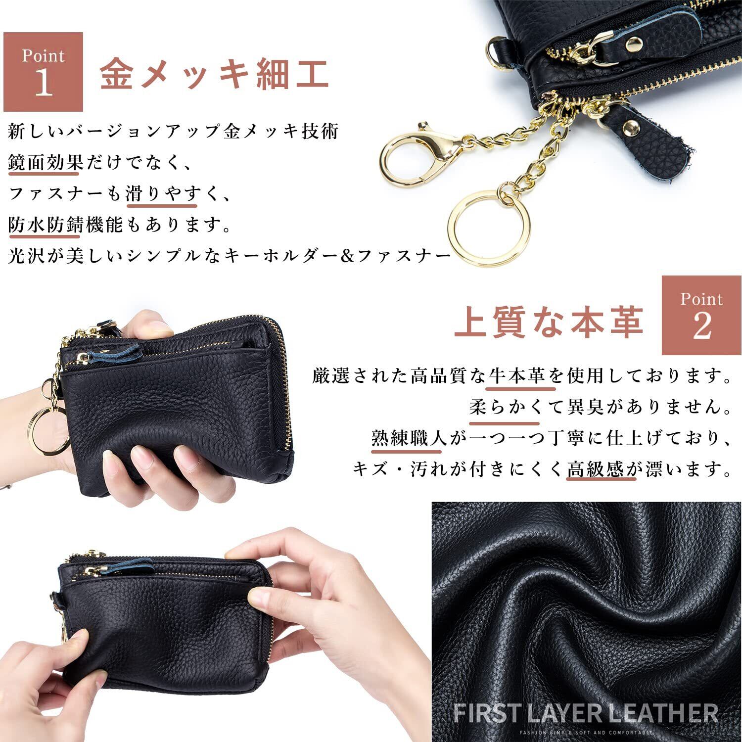 【実用性】ミニ財布は女性の日常的な使用に合わせて、女性のためにデザインされています。シンプルなデザインですが機能の多い小銭入れ。ツヤとハリのある上品な印象の牛革を使用しました。カードがぴったり入り、イヤホン、鍵もすっきり収納でき、お札も折りたたんで持ち歩きたい場合に便利なサイズです。