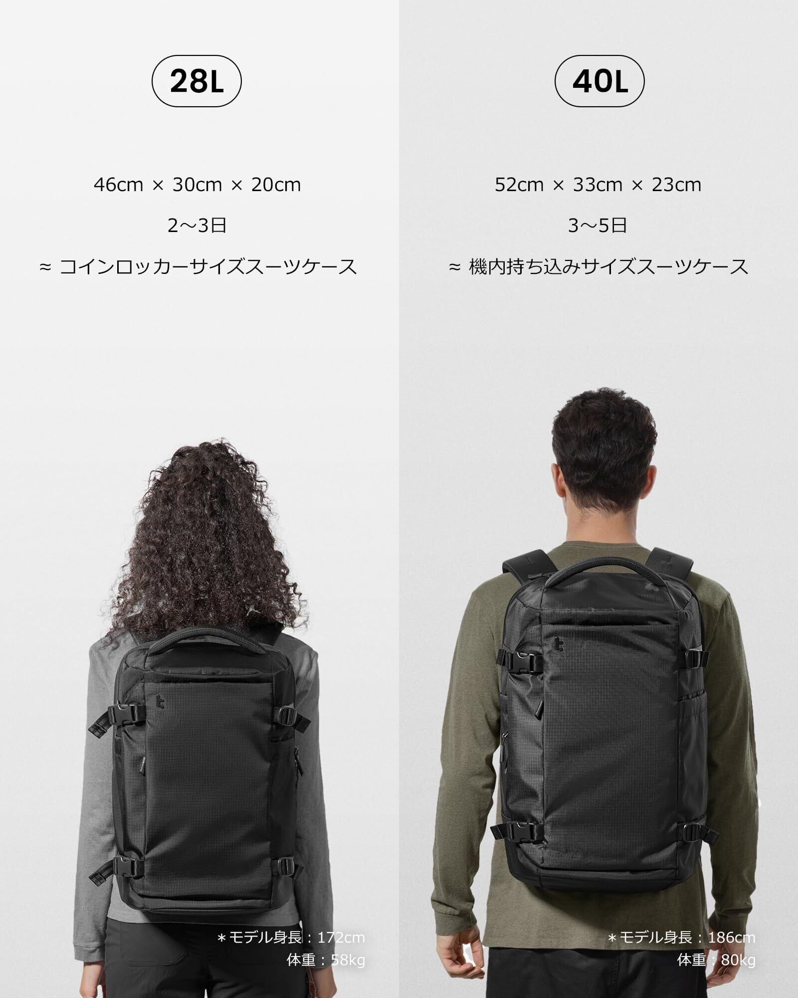 【40L大容量で数日間の旅もこれ1つ】旅行用バックパックとして設計された40Lモデルは、着替えやガジェット、洗面用品などを一括収納、長旅に必要なすべてを収め、2泊3日~4泊5日間の旅行に最適です。サイドにベルトの搭載により中身が少ない時もコンパクトに圧縮され、持ち運びが軽く、機敏な移動を実現します。機内持ち込み可能な外寸:52cm x 33cm x 23cm、重量:1070g。ご注意:手作りであることや、測定方法・条件の違いにより、サイズや重量に若干の差異が生じる場合がございます。