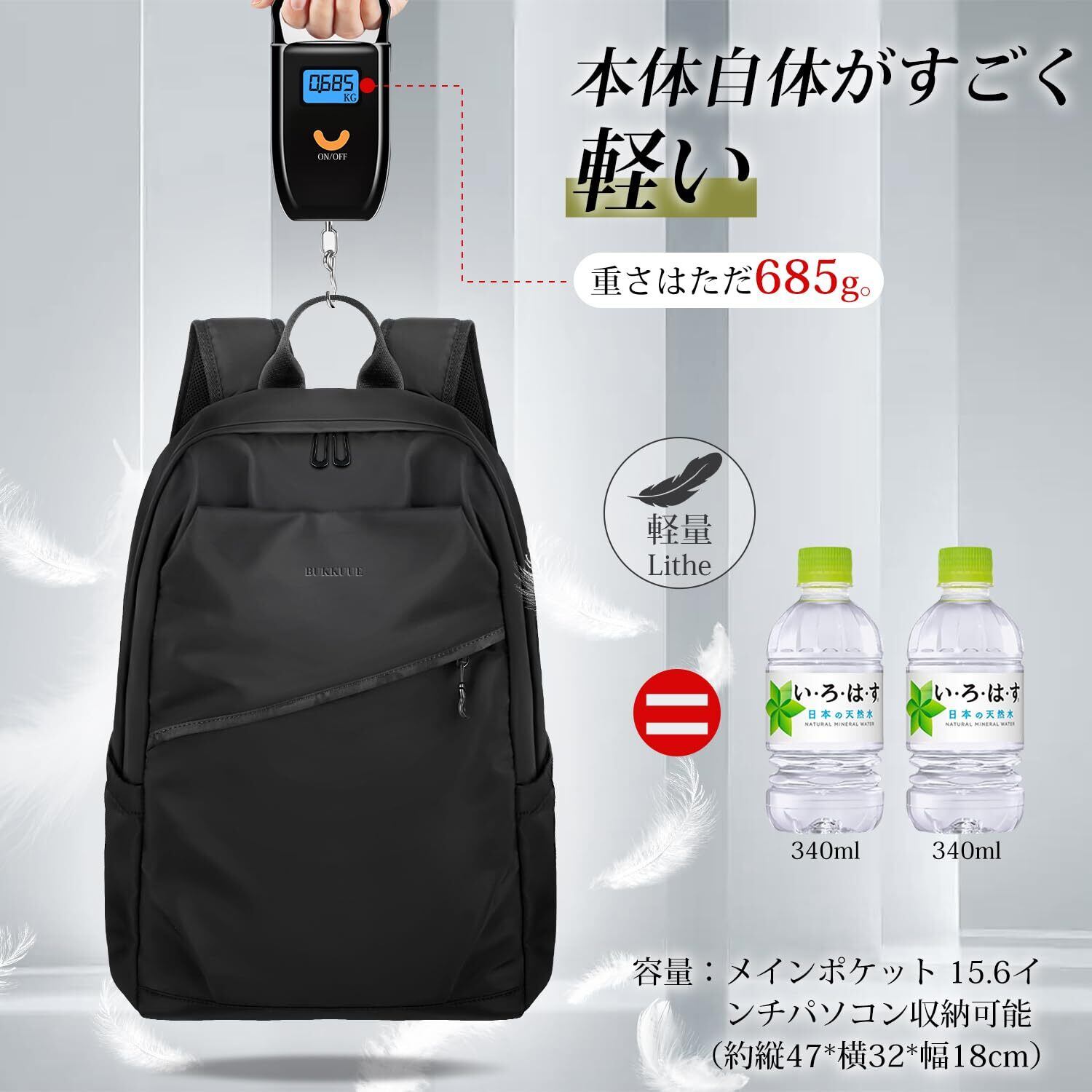 【軽量&大容量】バックパック本体は僅か0.7kgで、気にならない超軽量タイプです。ポケットは全部で14個があり、入れ物の整理整頓ができ、使いやすさは抜群です。A4サイズファイル、15.6インチPC、iPad、教科書、ペン、傘、衣類、飲み物、お弁当など全て一気に収納できます。充実した機能性を持ち合わせており軽量のため、毎日の通勤・通学はもちろん、休日のお出掛け、ショッピング、旅行、登山、プレゼント、防災用なども大活躍、ビジネスにも普段使いにも大変おすすめられるリュックです。
