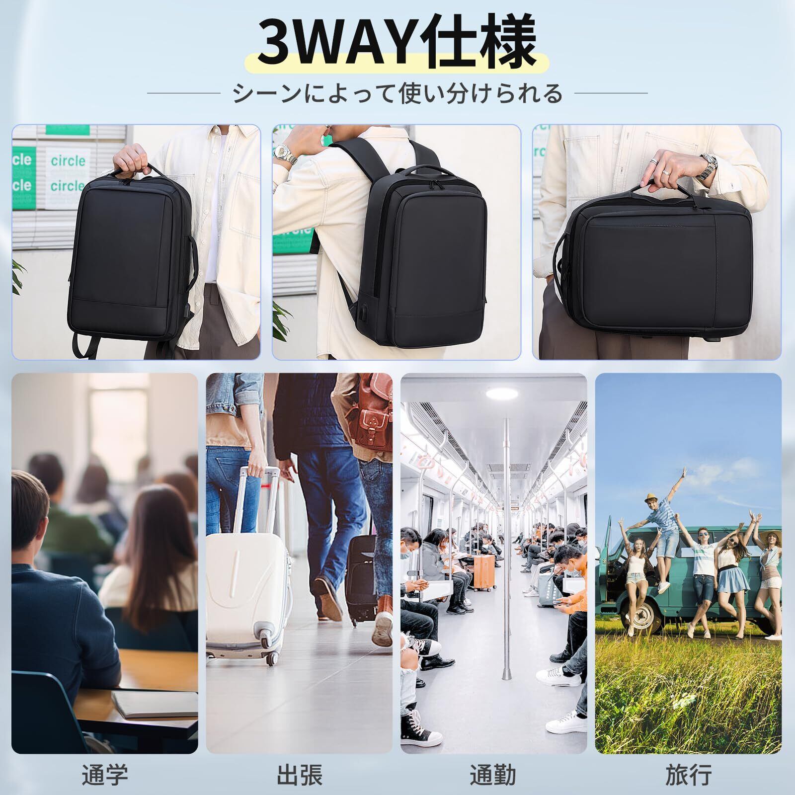【便利な3 WAY】ショルダーベルトの太さが適切で、クッション性のある通気メッシュ素材を採用し、両肩の負担を軽減し、気楽に体に背負うことができます。ショルダーベルトの長さは調節でき、身長や性別の異なるお客様に適しています。また、三角形の二重縫いの技術を採用し、より良い耐荷重能力を備えており、断裂することの心配はありません。3WAY仕様(リュック、横手提げ、縦手提げタイプ)、お客様やビジネスパートナーの前でリュックを取り外すと安心できます。さらに重要なのは、出張旅行用のスーツケースに掛けることができる専用キャリーオン帯も付いています。