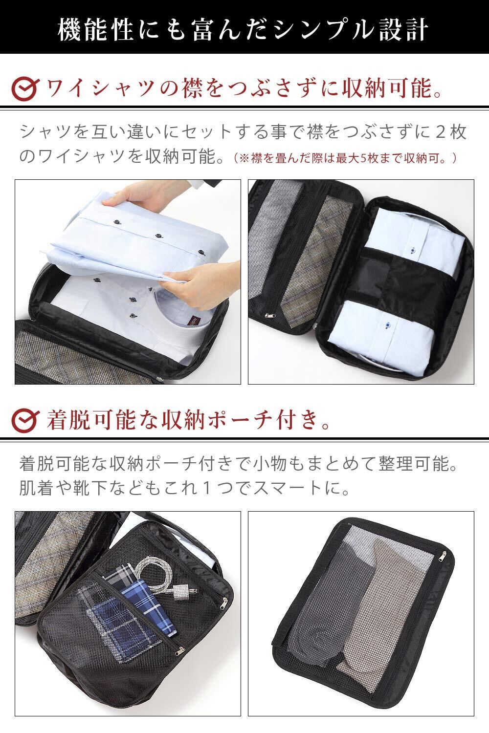 【 襟つぶれ・シワ防止 】ワイシャツのシワ、襟つぶれ、型崩れは出張時の悩みの種。改良を重ね、襟つぶれやシワを防止する設計に。ビジネスマンのための収納ケースとして高い評価を頂いています。