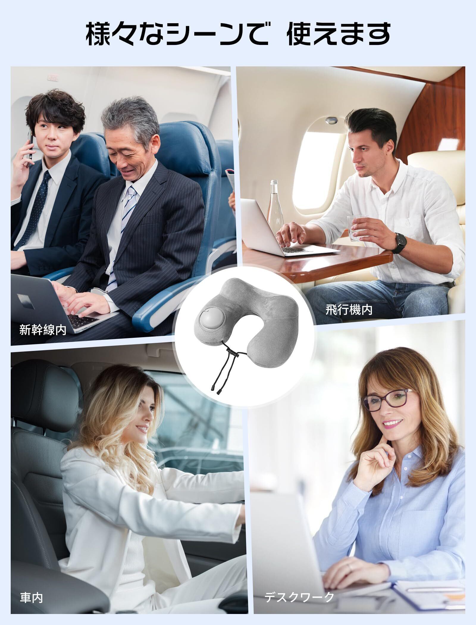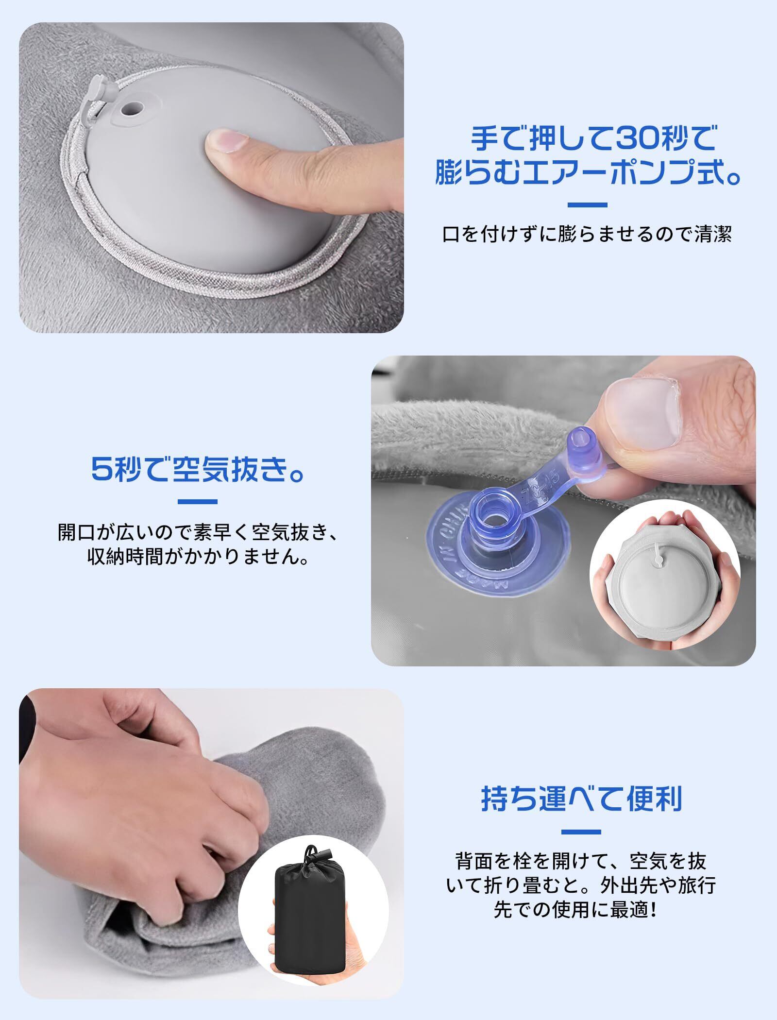 携帯枕 ネックピロー 首枕 U型 空気枕 持ち運び便利 旅行枕 収納ポーチ付き 洗えるカバー 飛行機 コンパクト 車 夜行深夜バス 新幹線 ソファ 旅行用最適 (グレー)