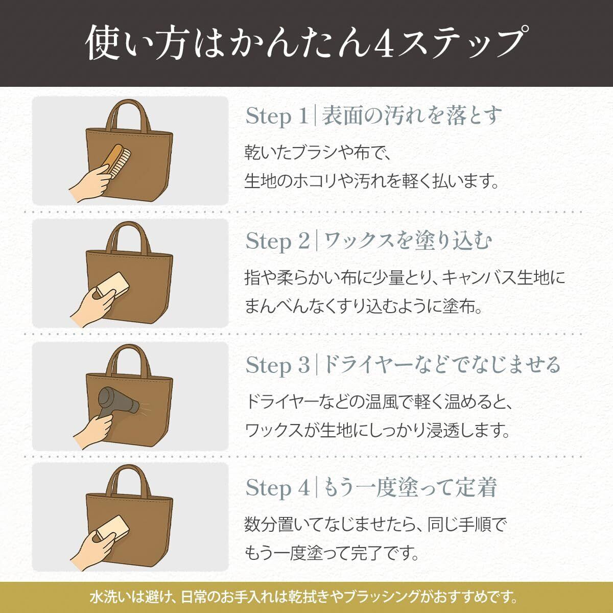使い方:生地の表面の汚れをブラシで落とし、ワックスを摺り込んでください。そのごドライヤーなどで温めて生地に馴染ませてから硬化させ、これらを2回行って完了です。