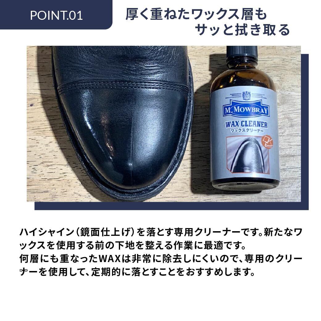 ・ハイシャイン(鏡面仕上げ)を落とす専用クリーナーです。・新たなワックスを使用する前の下地を整える作業に最適です。■用途:スムーズレザー用鏡面磨き(鏡面仕上げ/ハイシャイン仕上げ)落とし■原産国:日本製■容量:100ml■使用方法※ご使用前に必ず注意事項を確認して下さい。1.ワックスクリーナーをリムーバークロスに適量とります。2.ハイシャイン(鏡面仕上げ)を施した部分を数回、力を入れずにやさしく拭きます。3.1〜2回ほど拭き取るとハイシャインに使用した古いワックスが溶け、クロスに付着します。4.仕上げに、M.モゥブレィ ステインリムーバー(別売り)をきれいなクロスに適量取りやさしく拭いてください。M.モゥブレィ ステインリムーバーを使用し残りのワックスを拭き取ります。5.乳化性靴クリームで栄養補給・保湿をしてください。