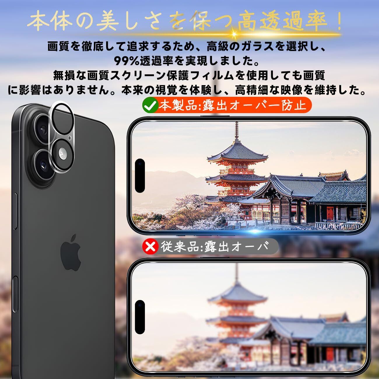 【超高透過率】新しいアップグレードした光学プロジェクション技術を使って、液晶画面保護ガラス フィルムを改良した後、約99.9%高い光線透過率に達し、より高い光透過率と超クリアな視覚体験を実現します。しかも液晶画面の本来の美しさにも影響しません。高精細度でいつでも写真やビデオをきれいに撮影することが可能です。