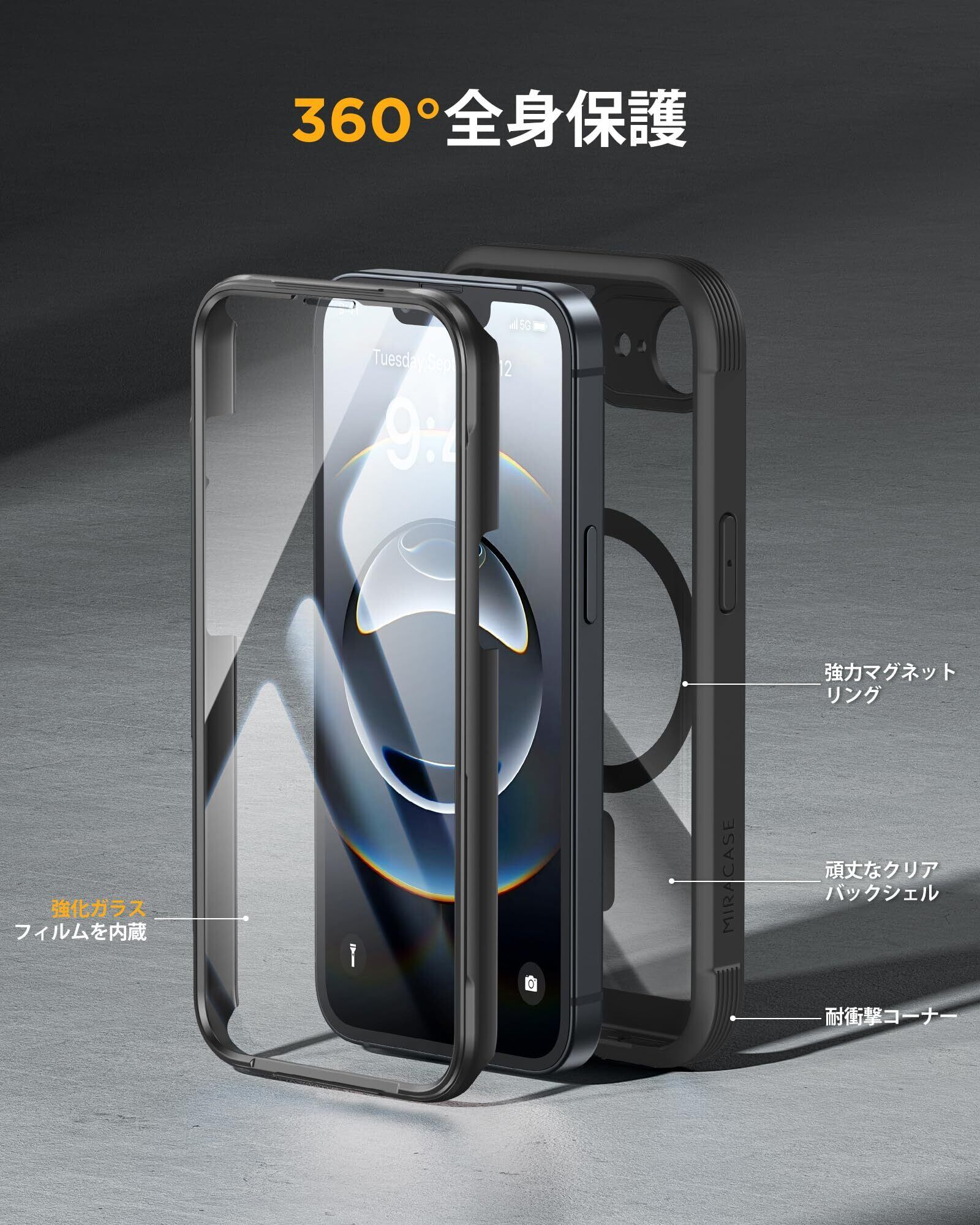 Miracase iPhone 16E ケース MagSafe対応 あいふおん16e スマホケース 2025 9H強化ガラス 6.1インチ フルカバー 360°全身保護 ワイヤレス充電対応 黒