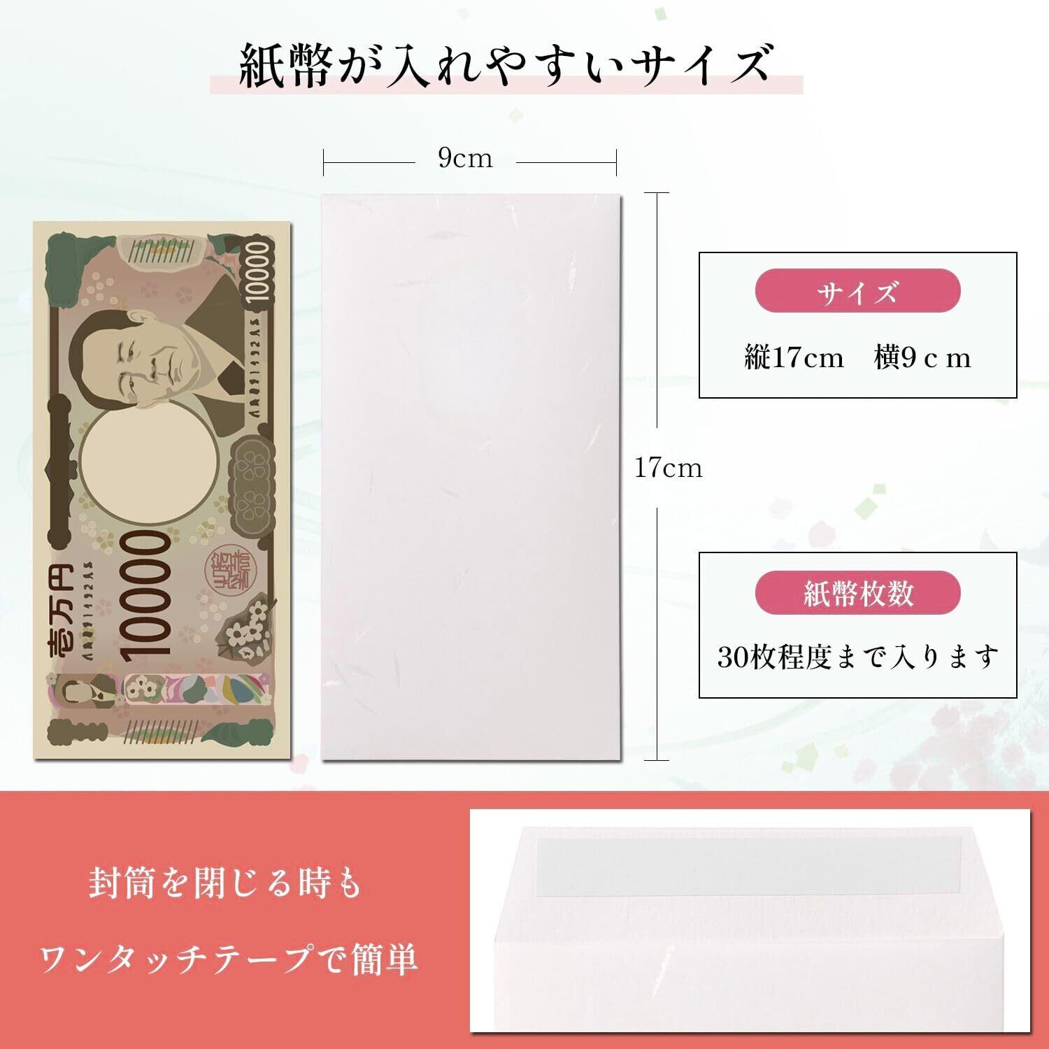 【安心サイズ】 17cm×9cmのワイド設計で、お札がそのまま入ります。裏面には便利なテープ付きで、封入もスムーズ。